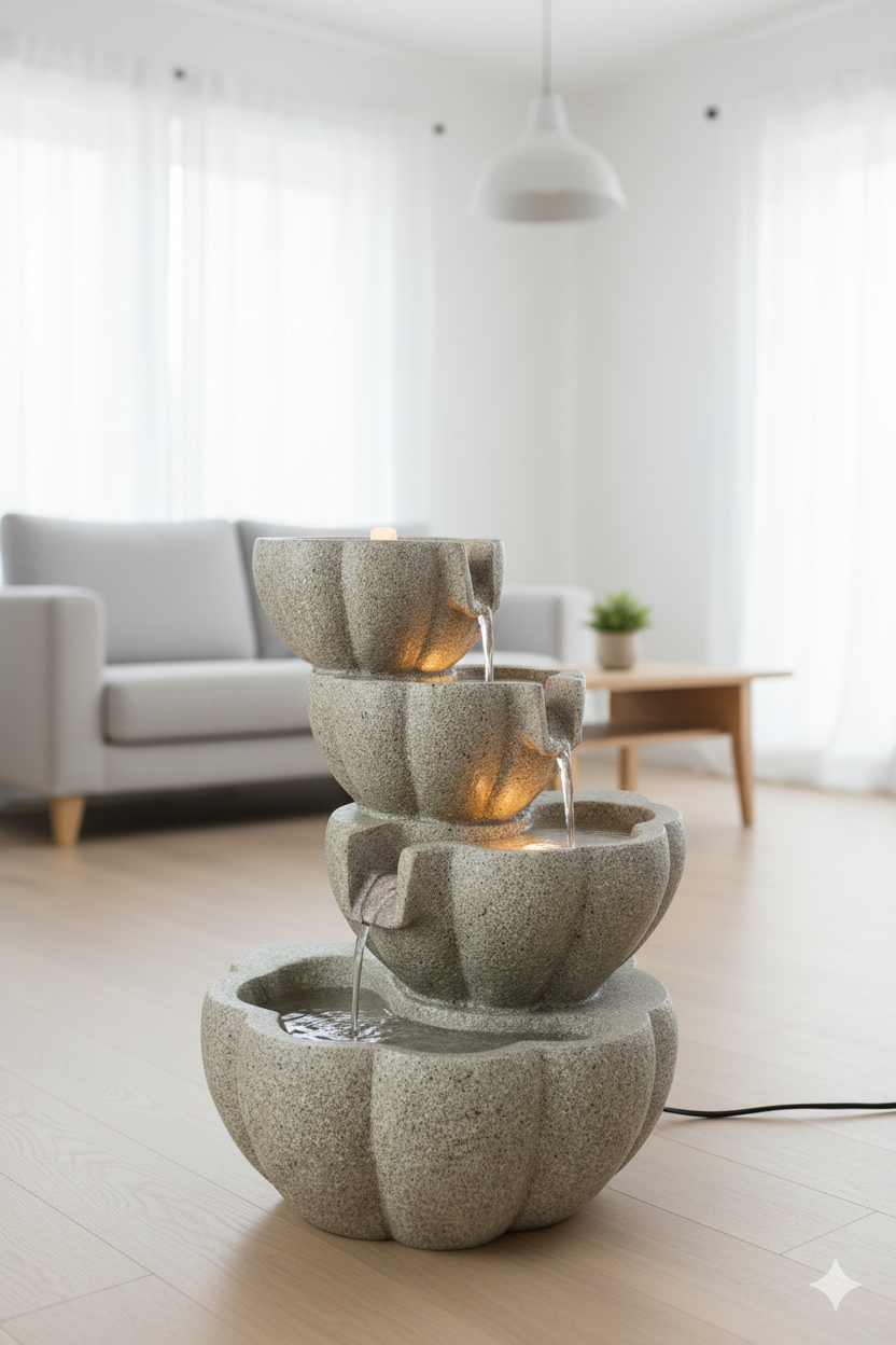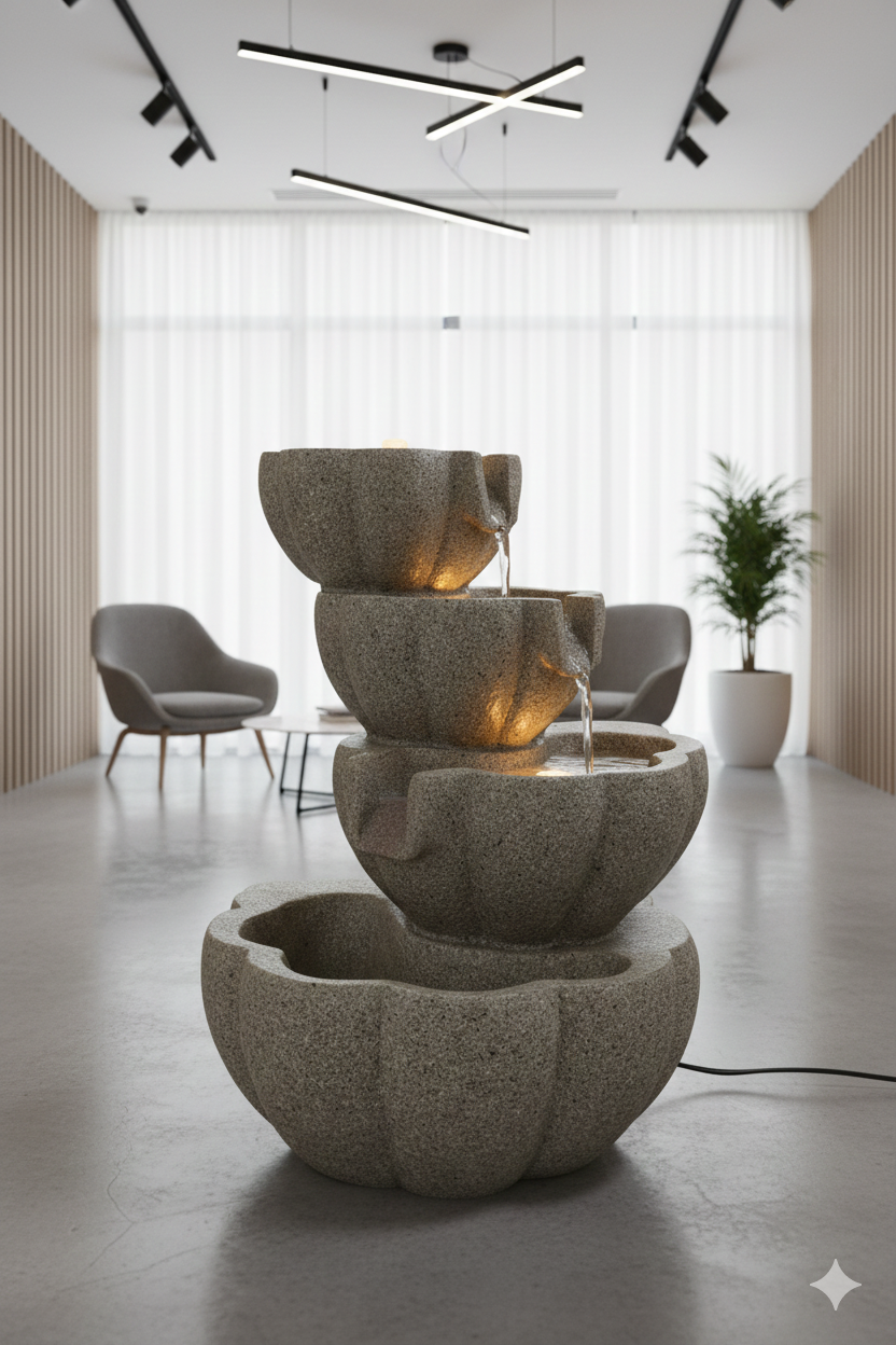 • Illumination: Integrated bright warm LED lighting is placed beneath the lips of the upper bowls. This illumination highlights the flowing water and the texture of the stone, creating a soft, tranquil glow.