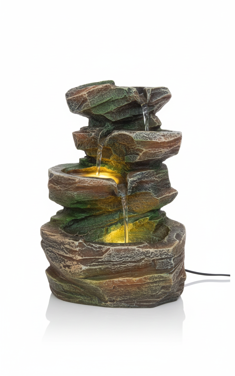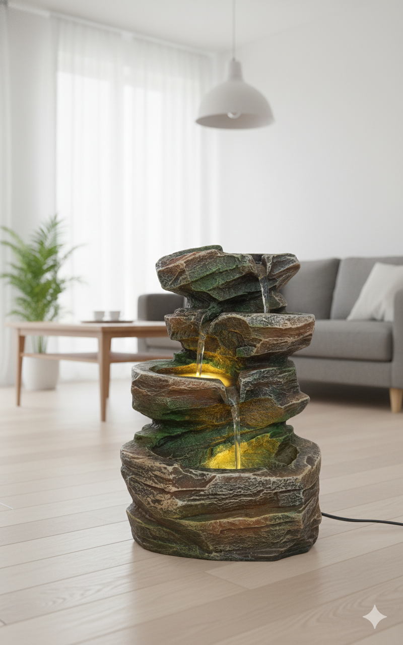 Tranquil Sound: Operates with a quiet submersible pump (included), generating the gentle, continuous, and rhythmic sound of water flowing over the multiple tiers.