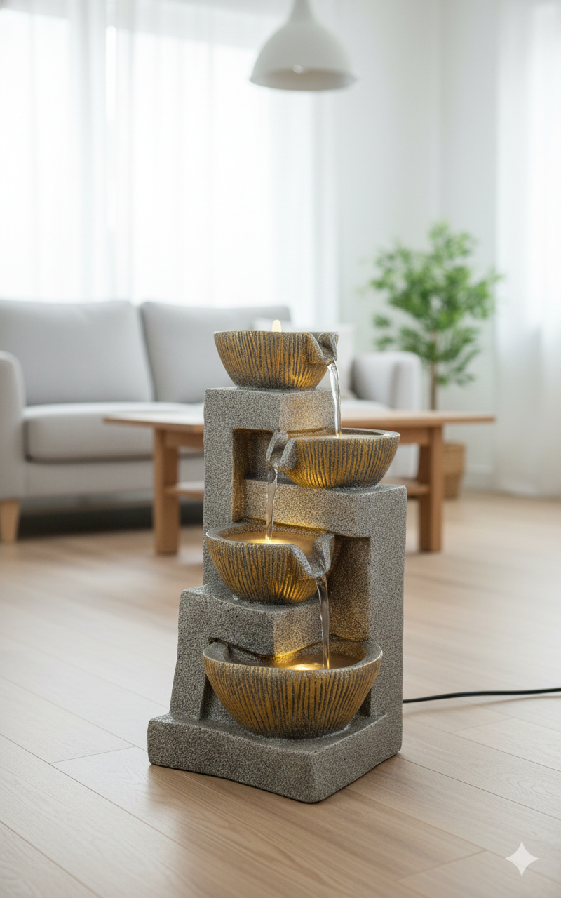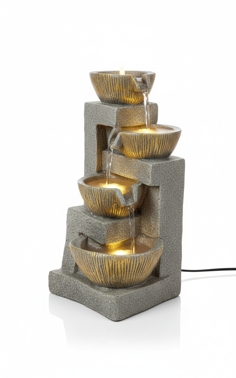 Illumination: Integrated warm LED lighting is discreetly positioned to highlight the flowing water and brightly illuminate the golden Buddha statue, creating a dramatic focal point.