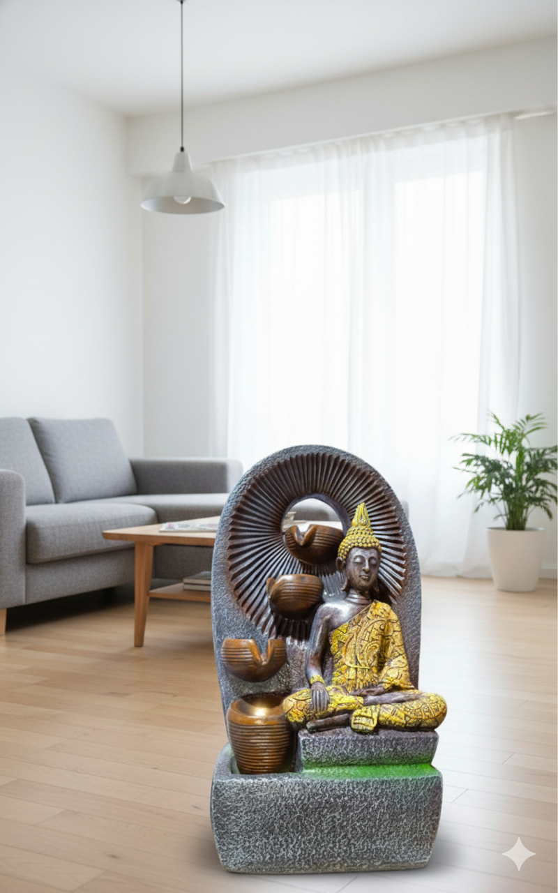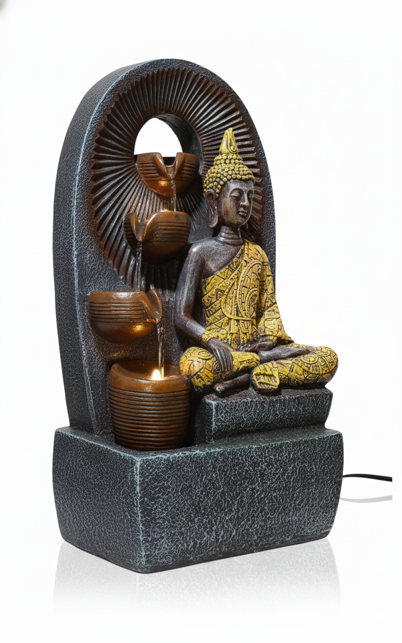 Design: Features a meditating Lord Ganesha statue. The water is channeled through four sequential bowl tiers on the left side of the arch and also includes a decorative vase element.