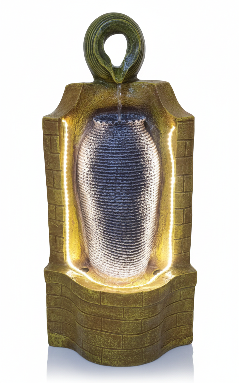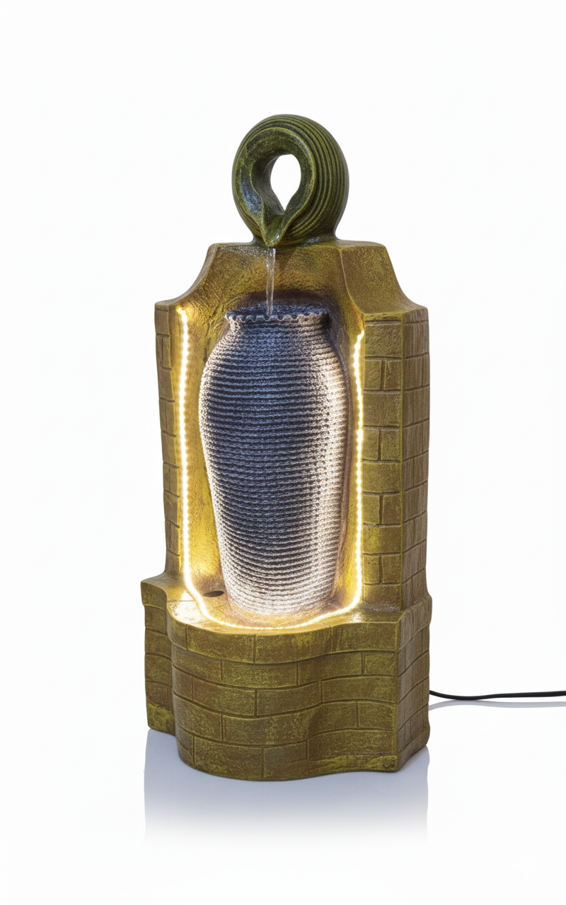 Illumination: Integrated bright warm LED strip lighting is strategically placed along the inner edges of the niche and within the top spout. This powerful lighting dramatically highlights the falling water and the textured urn, creating a brilliant, inviting glow that contrasts beautifully with the dark urn, enhancing the fountain’s beauty and visibility.