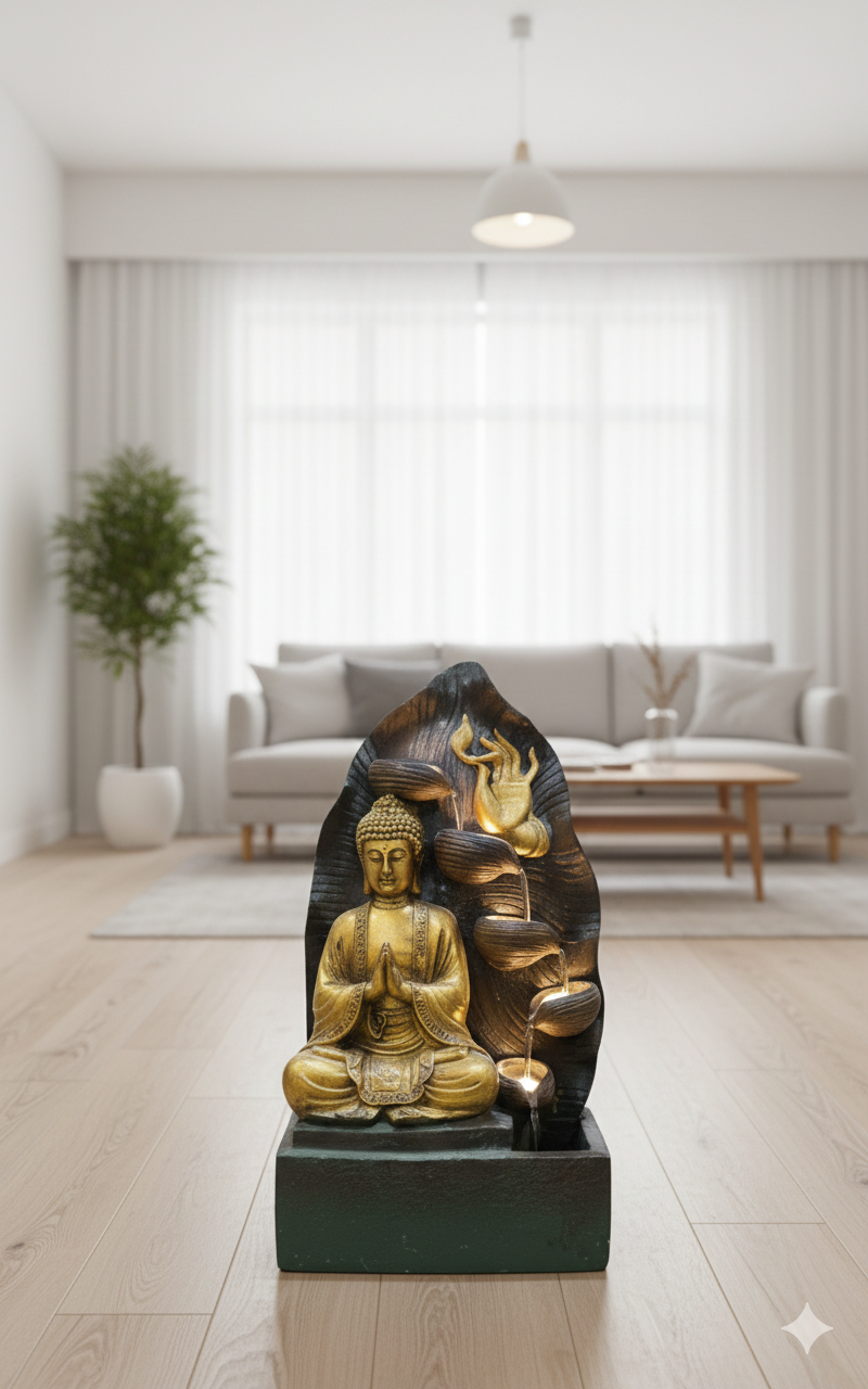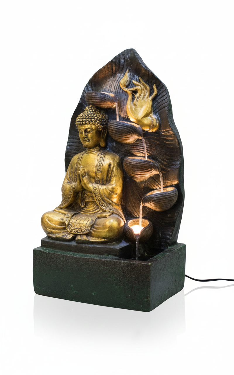 Design: Features a subtle, calming profile of the Buddha’s face and an extended hand. The water creates a shimmering ripple effect down the panel, emphasizing the textured stone and creating a strong visual presence.