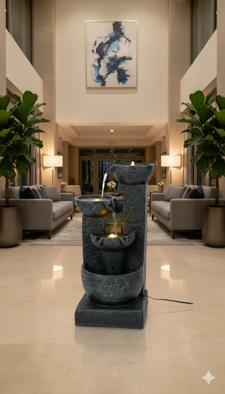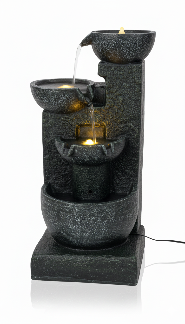 Illumination: Integrated warm LED lighting is strategically placed within the basin of the upper bowls, highlighting the falling water and the textured interior surfaces. This illumination creates a subtle, inviting glow, transforming the water movement into a peaceful, luminous display.