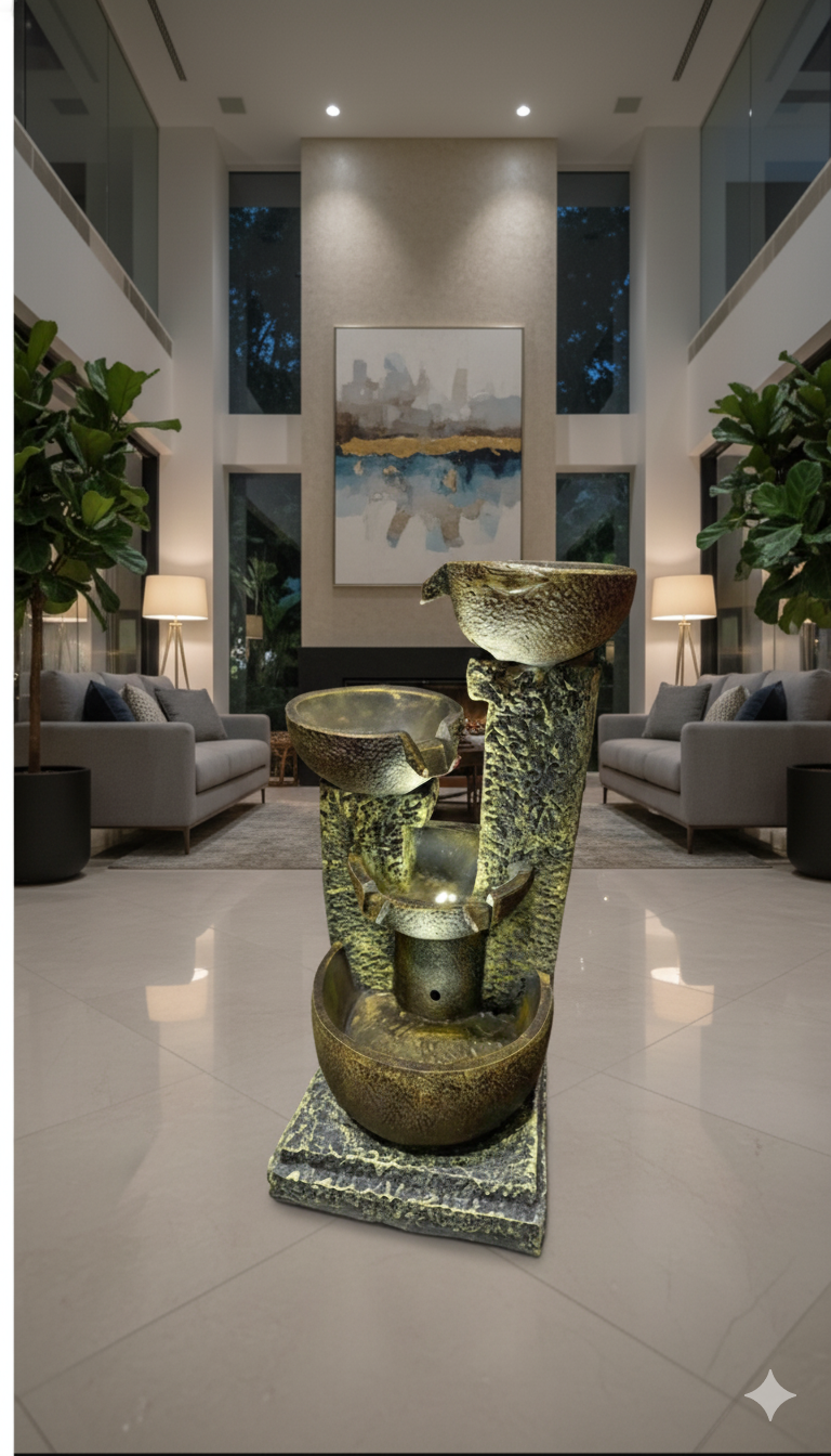 • Design: The fountain features a tall, three-tiered structure composed of wide, shallow bowls and textured columns. Water flows from the top bowl, gracefully pouring into the second and third bowls below, culminating in the deep base basin. The design evokes natural rock formations with a touch of aged elegance.