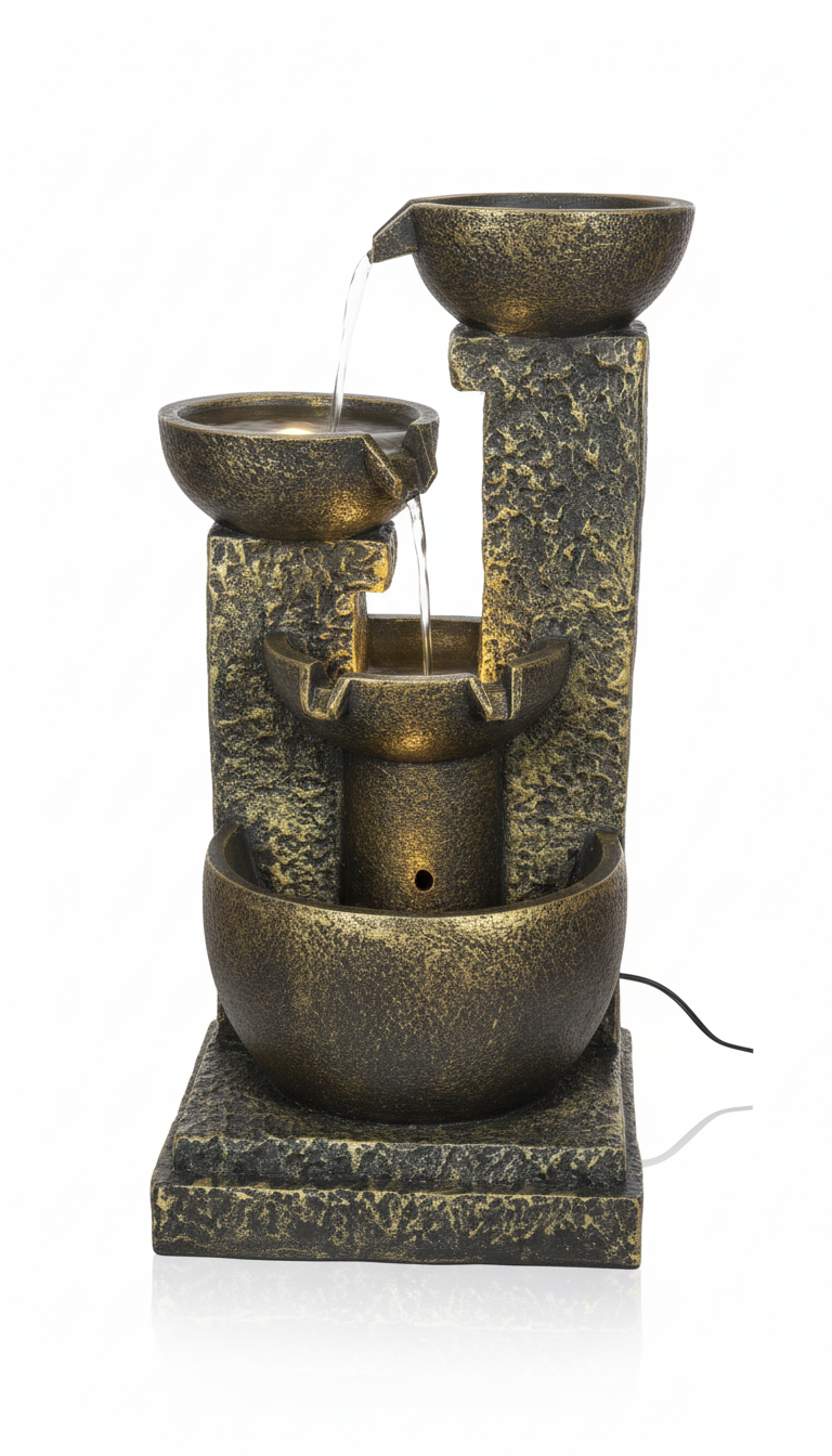 Infuse your home or garden with the tranquil charm and warm glow of cascading water with this elegant 36 Inch (3 Feet) Three-Tiered Rustic Golden Bowl Waterfall Fountain by Art O Hub. This vertical feature combines a textured, antique bronze-like finish with three distinct levels of water flow, creating a sophisticated and inviting natural element for any space.