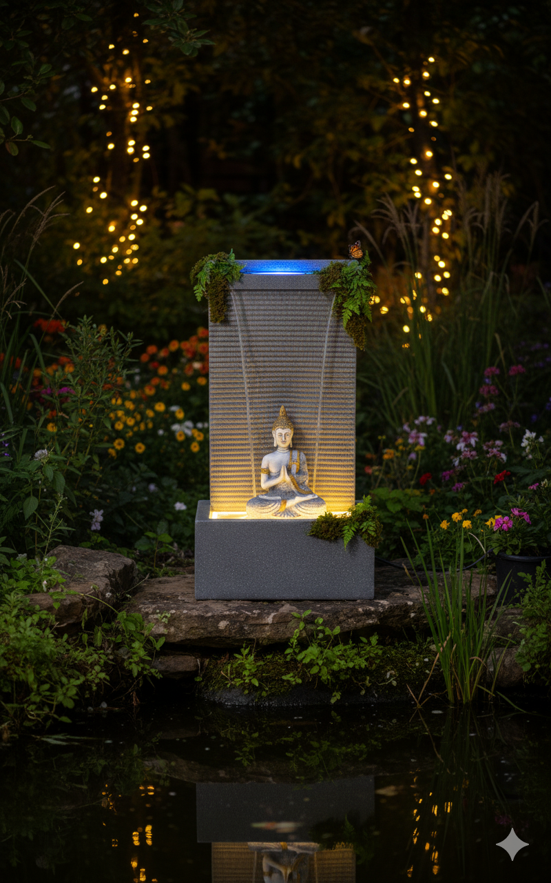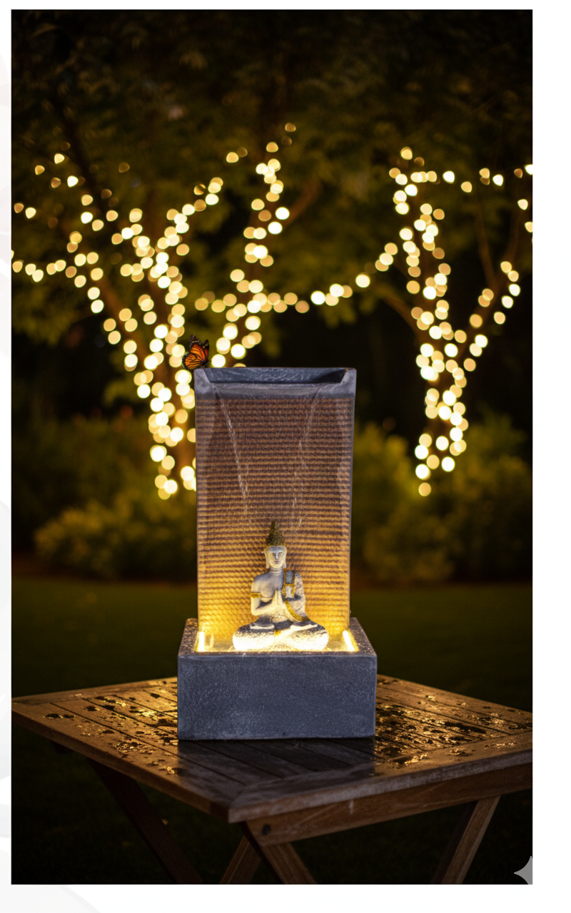 Illumination: Integrated warm LED lighting is placed within the basin, specifically illuminating the seated Buddha and the descending water curtain. This creates a mesmerizing and sacred glow that emphasizes the spiritual subject and turns the water into a shimmering focal point.