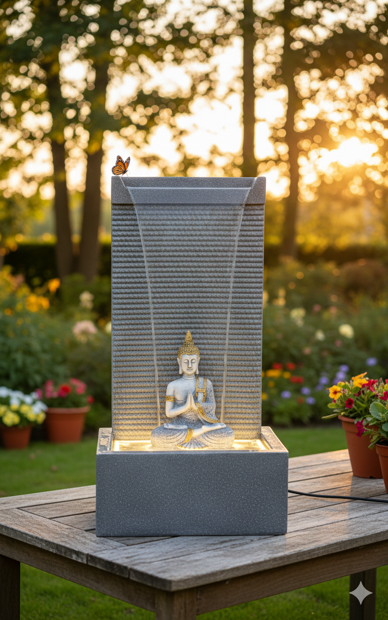 Design: The fountain features a tall, rectangular back slab with a finely textured (ridged) surface. Water flows over the entire face of this slab in a graceful, clear sheet, forming a tranquil curtain of water that descends behind a seated Buddha statue (in the Dhyana Mudra), who rests on a platform in the wide, square basin.