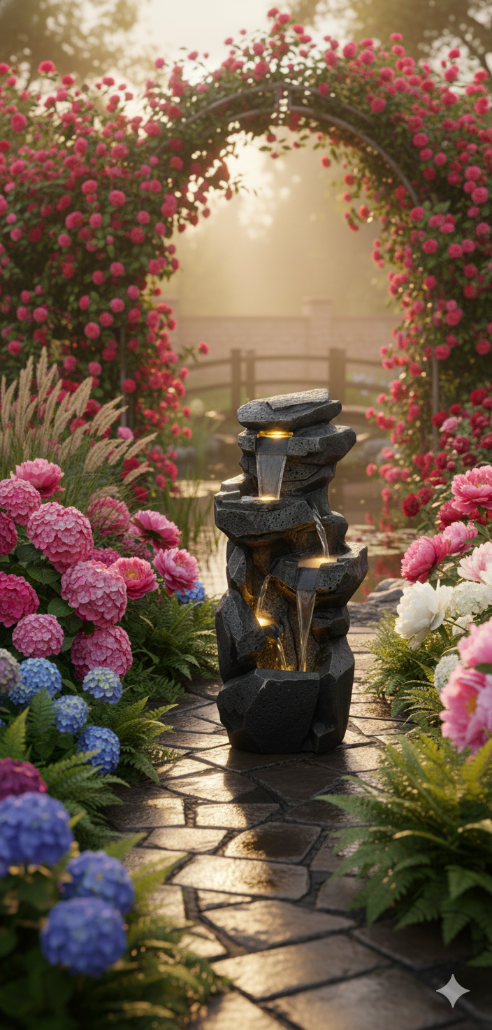 Illumination: Integrated warm LED lighting is strategically placed beneath the water flow at several key tiers. This powerful illumination brightly highlights the moving water and the textures of the faux rock, creating a stunning, dramatic glow that transforms the piece into an enchanting spectacle after dusk.