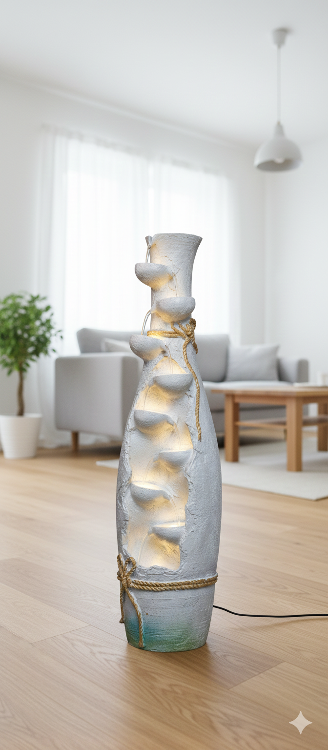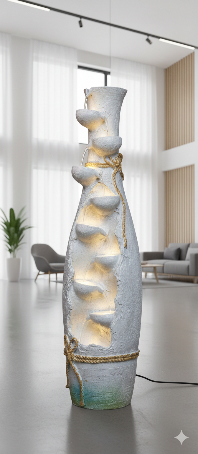 • Illumination: Integrated warm LED lighting is placed within each basin. This illumination beautifully highlights the texture of the pots and the flowing water, creating a stunning, intimate glow, especially in the evening.