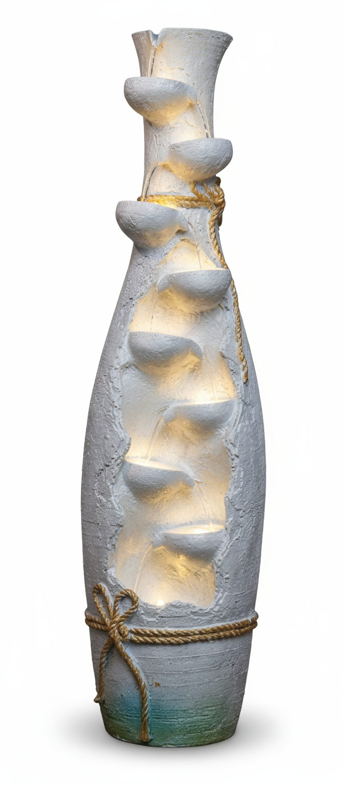 • Design: Features a vertical, organically twisted log/rock formation. The water flows through six separate, integrated pot-like bowls, offering a dynamic and continuous multi-tier cascade.