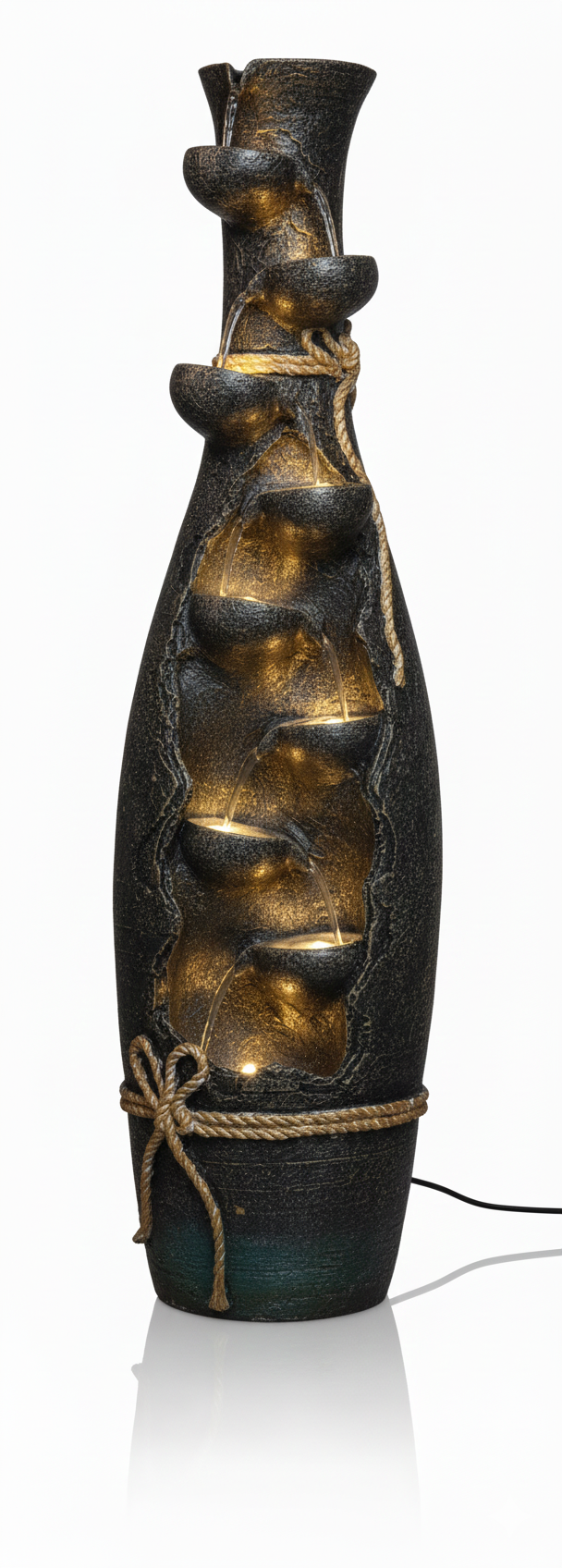 • Illumination: Integrated warm LED lighting is strategically placed beneath the lip of several tiers. This illumination highlights the texture of the copper-toned rock and the fast-flowing water, creating a powerful effect after dark.
