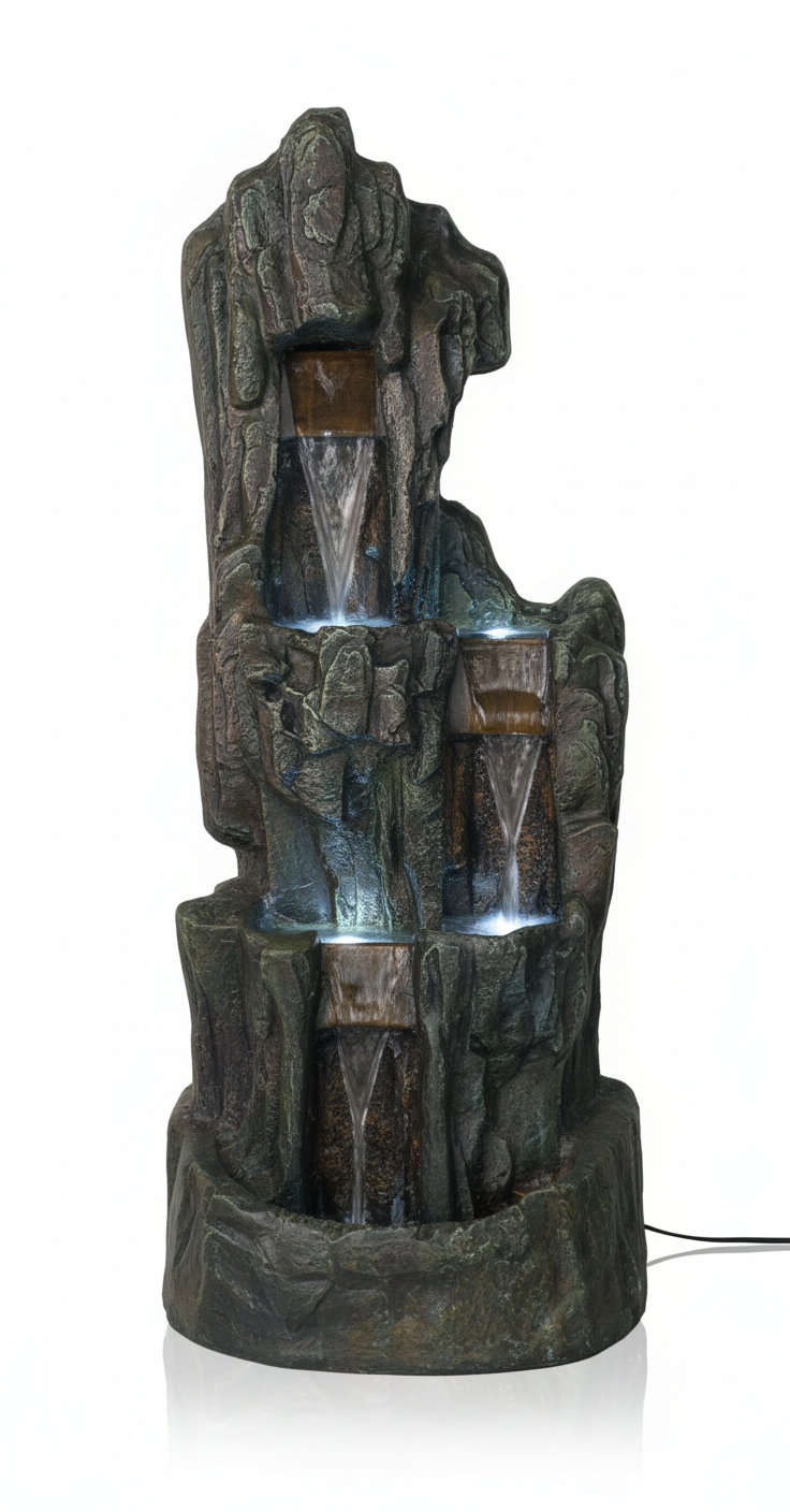 Design: The fountain is a magnificent, tall sculpture of layered, rugged faux rock, expertly crafted to create multiple tiers and deep vertical channels. Water flows from the top, cascading down the textured rock face and into distinct, illuminated channels before collecting in the wide base basin, maximizing the visual impact and the sound.