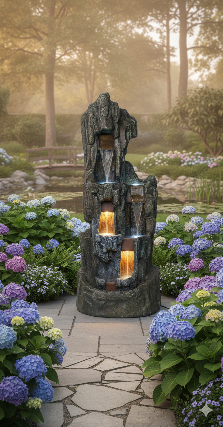 Illumination: Integrated cool white LED lighting is strategically placed above and within the water channels. This powerful illumination brightly highlights the moving water, creating a stunning, dramatic spectacle that contrasts with the dark, textured stone, making it an enchanting feature after dusk.