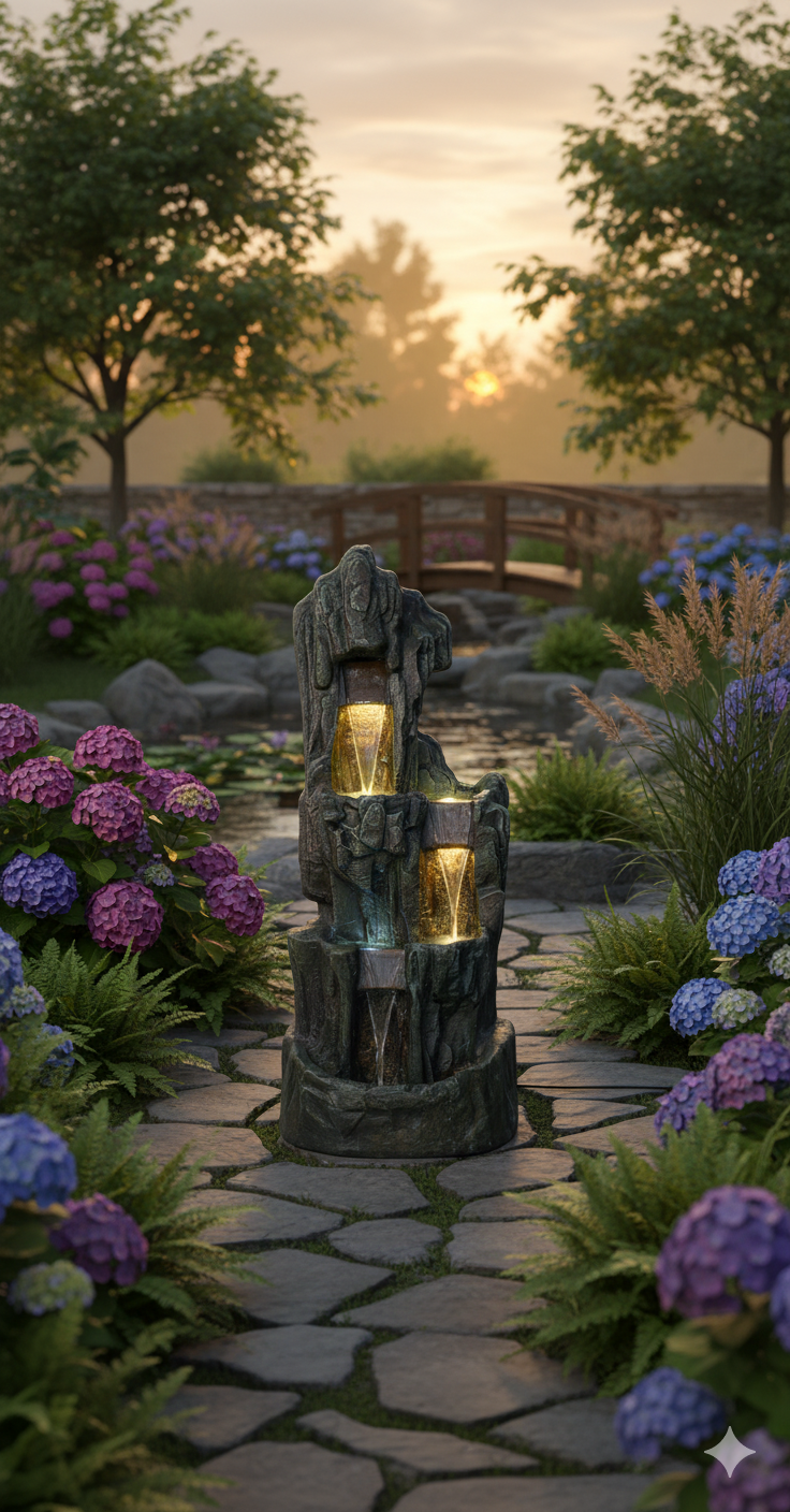 Expansive Outdoor Gardens & Water Features: As a central, illuminated landscape element.