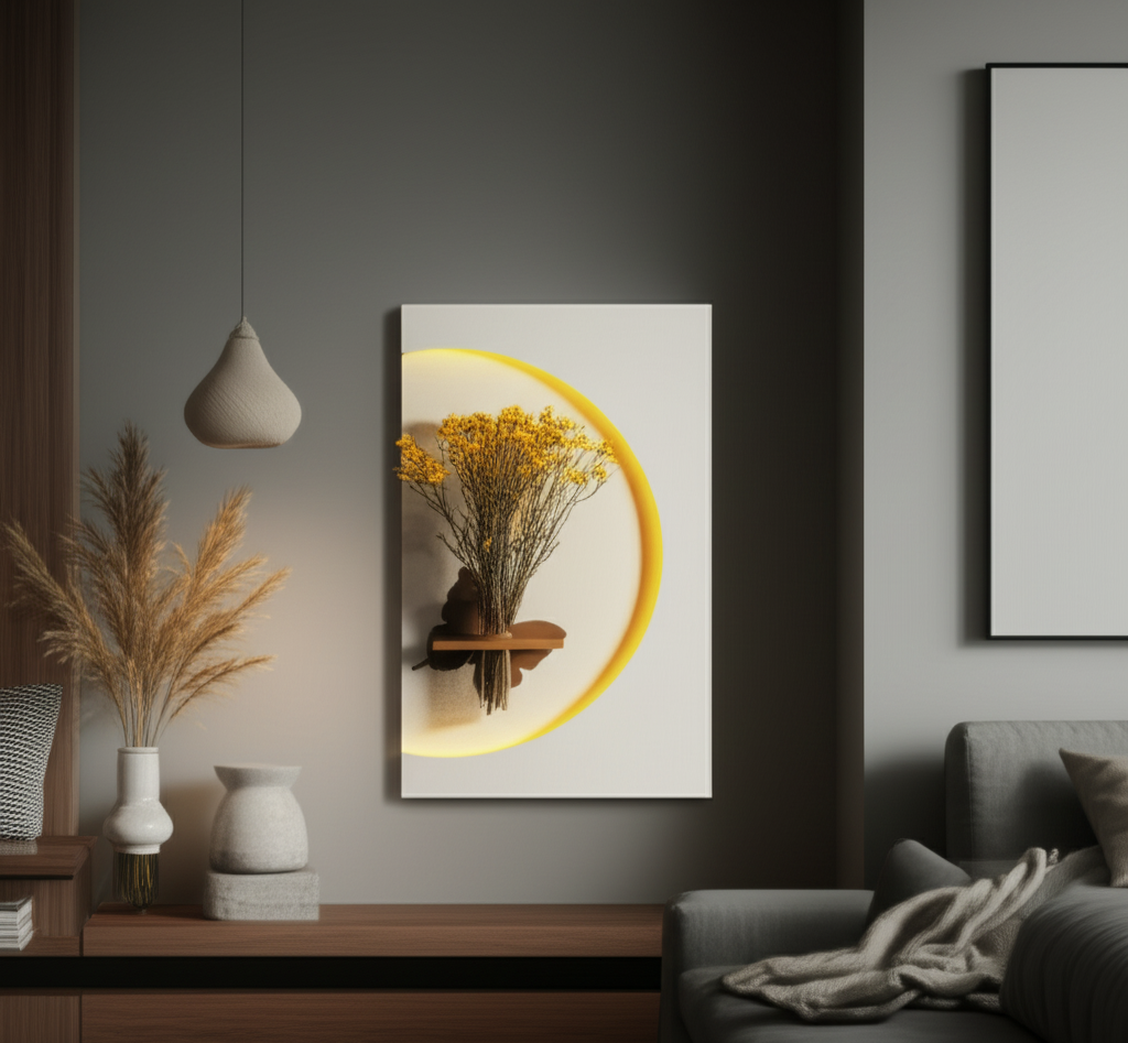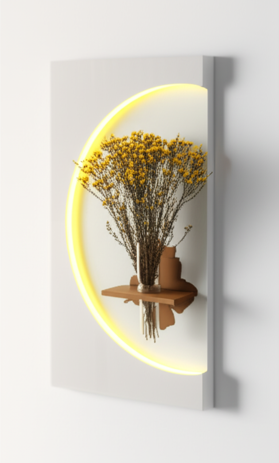 Each Lunar Bloom Wall Art is meticulously handmade, featuring a crisp, rectangular panel. The design is brought to life by a bold, integrated semicircular light that casts a warm, inviting glow, creating a stunning halo effect. Within this radiant arc, a subtle, integrated shelf with a vase holder provides the perfect stage for showcasing your favorite dried flowers, fresh botanicals, or even artistic arrangements. The interplay of the soft light, geometric form, and natural elements creates a serene and refined ambiance, seamlessly blending with minimalist, contemporary, and even bohemian interior styles.