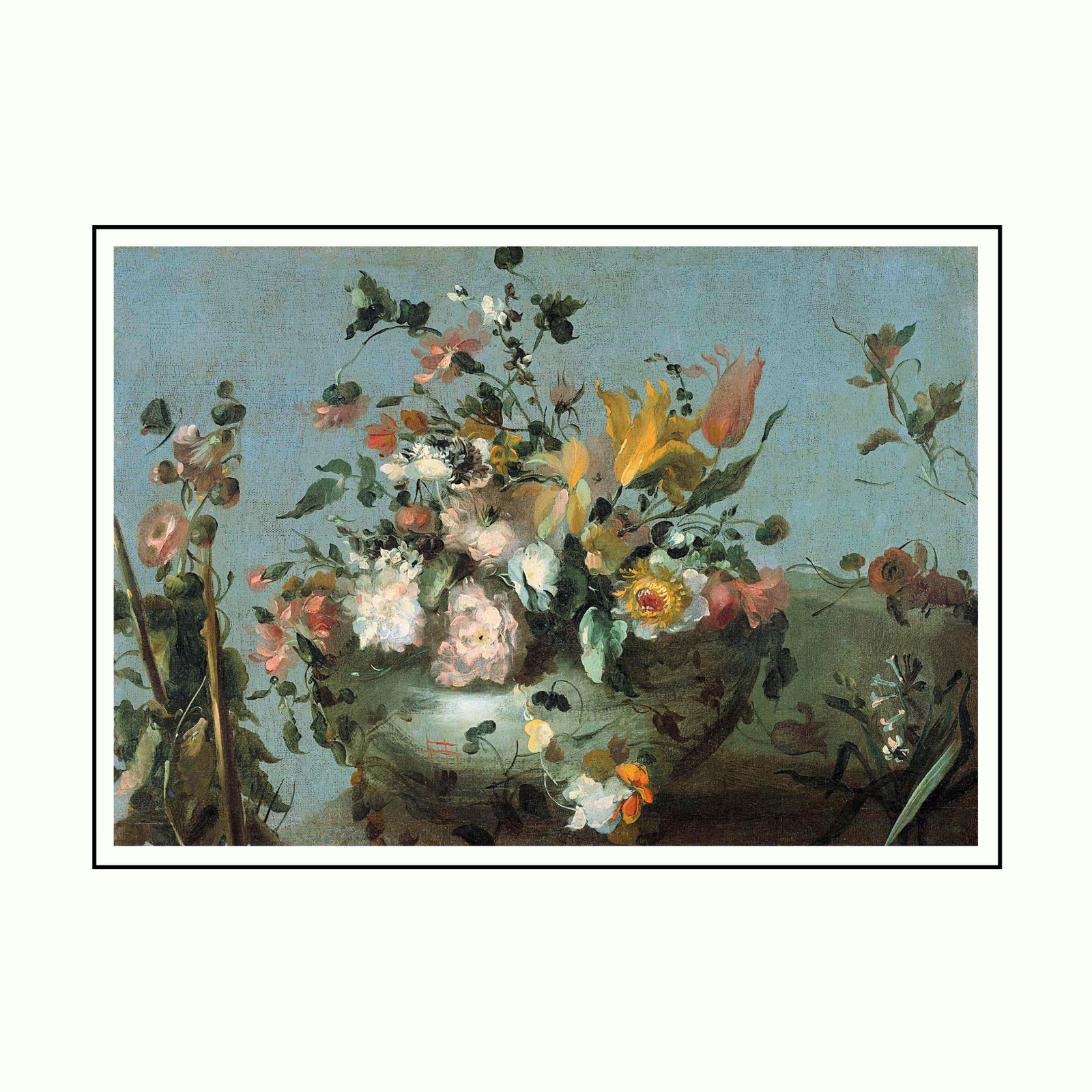 Adorn your walls with the timeless opulence of “Baroque Bloom,” an exquisite canvas print exclusively from Art O Hub. This magnificent artwork is a classical still-life masterpiece, capturing a lavish arrangement of diverse flowers overflowing from an ornate vase. Each bloom, from delicate pink roses and vibrant yellow lilies to crisp white blossoms and rich red accents, is rendered with meticulous detail and a painterly touch, creating a sense of lush abundance and natural beauty. Trailing vines and verdant foliage cascade gracefully, adding depth and movement to the composition, all set against a serene, muted blue-grey background that enhances the vibrancy of the floral display.