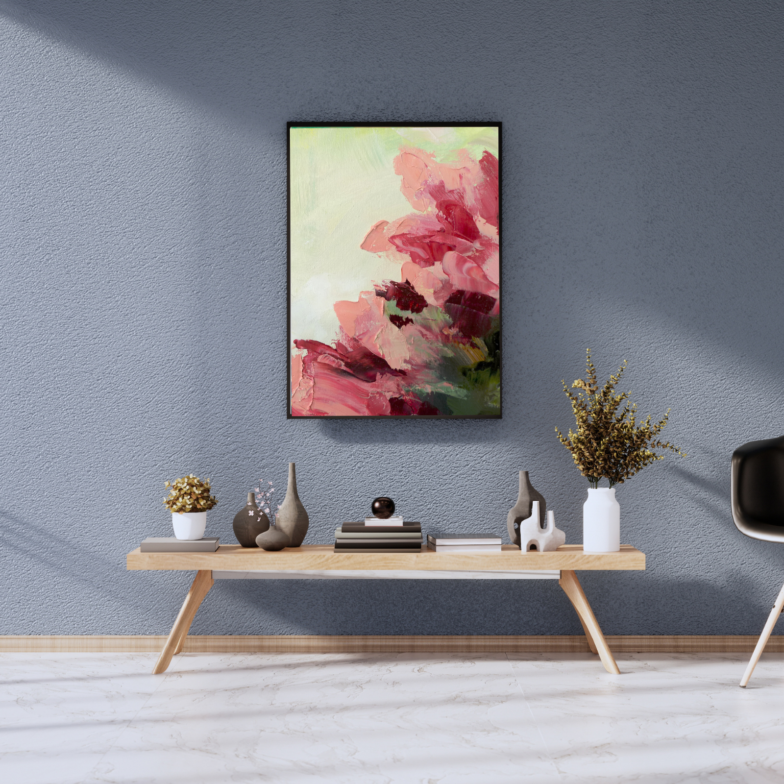 “Blush Bloom” is more than just a painting; it’s a celebration of nature’s beauty and the tactile joy of art. The visible textures of the paint invite you to imagine the softness of petals and the freshness of a spring morning. This piece is perfect for those who appreciate modern floral art, expressive abstract forms, and seek to add a touch of romantic elegance and vibrant color to their interior. It makes a stunning focal point in a living room, adds a sophisticated softness to a bedroom, or brings a refreshing burst of life to a dining area.