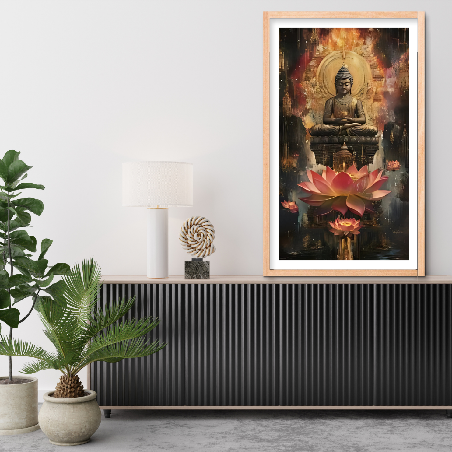 Each brushstroke and texture in the artwork reflects spiritual depth—making it more than just décor, but a visual mantra for tranquility. The lotus flower, an ancient emblem of purity and rebirth, flourishes in the background while the Buddha’s serene gaze anchors your space in calmness and balance.