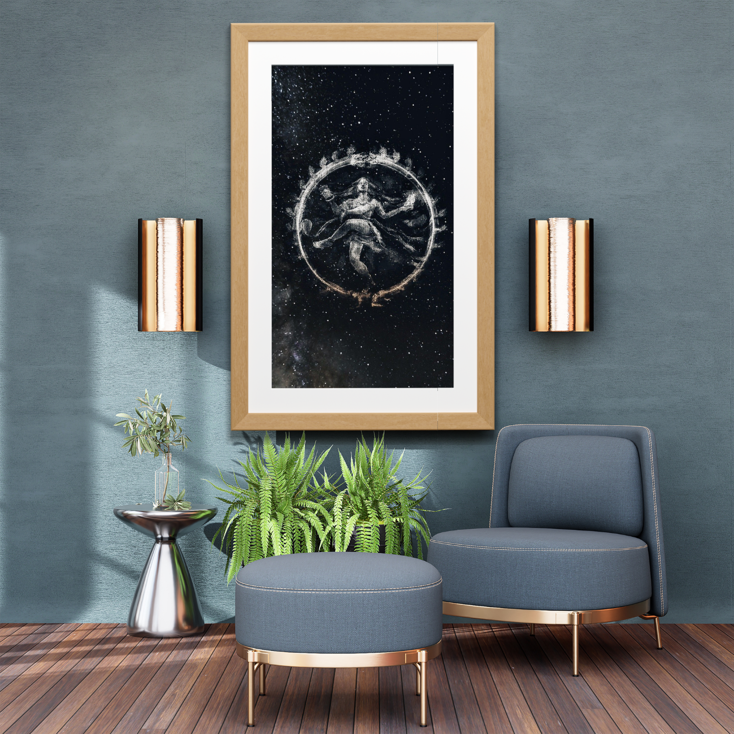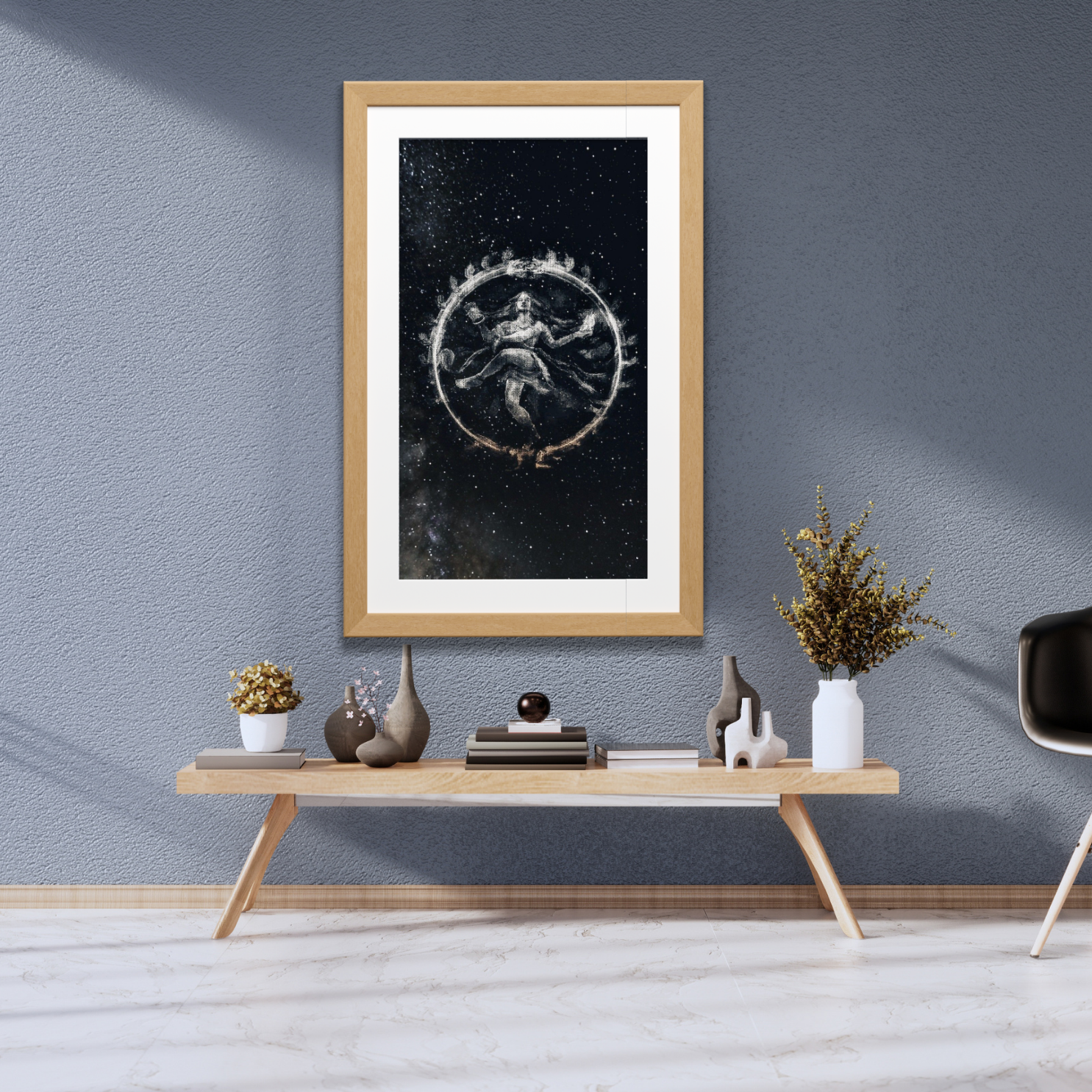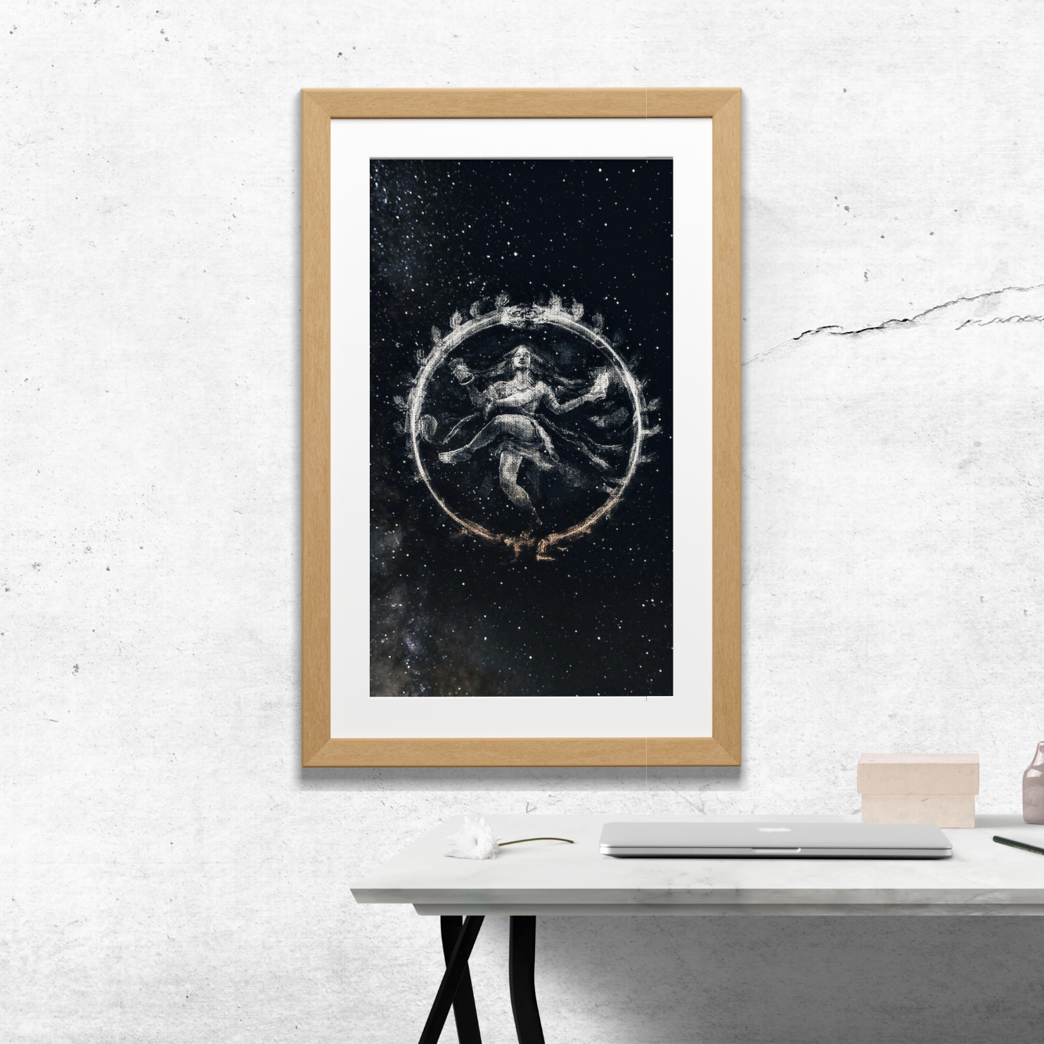 His flowing hair, poised limbs, and tranquil expression create a stunning visual harmony that bridges ancient mythology with cosmic mysticism. The starry backdrop adds depth and reverence, making this piece ideal for meditation spaces, temple interiors, or spiritual art collections.