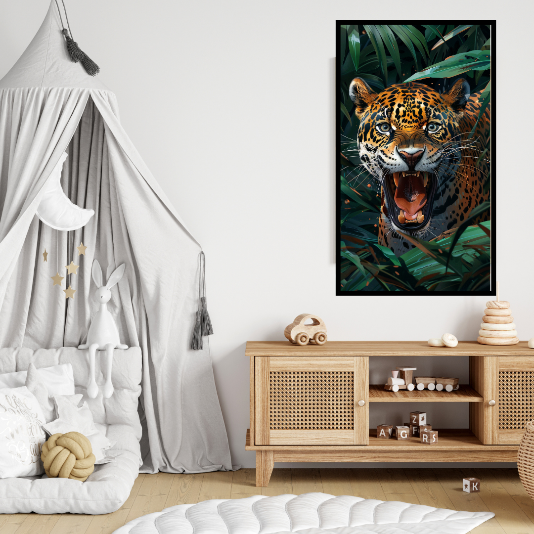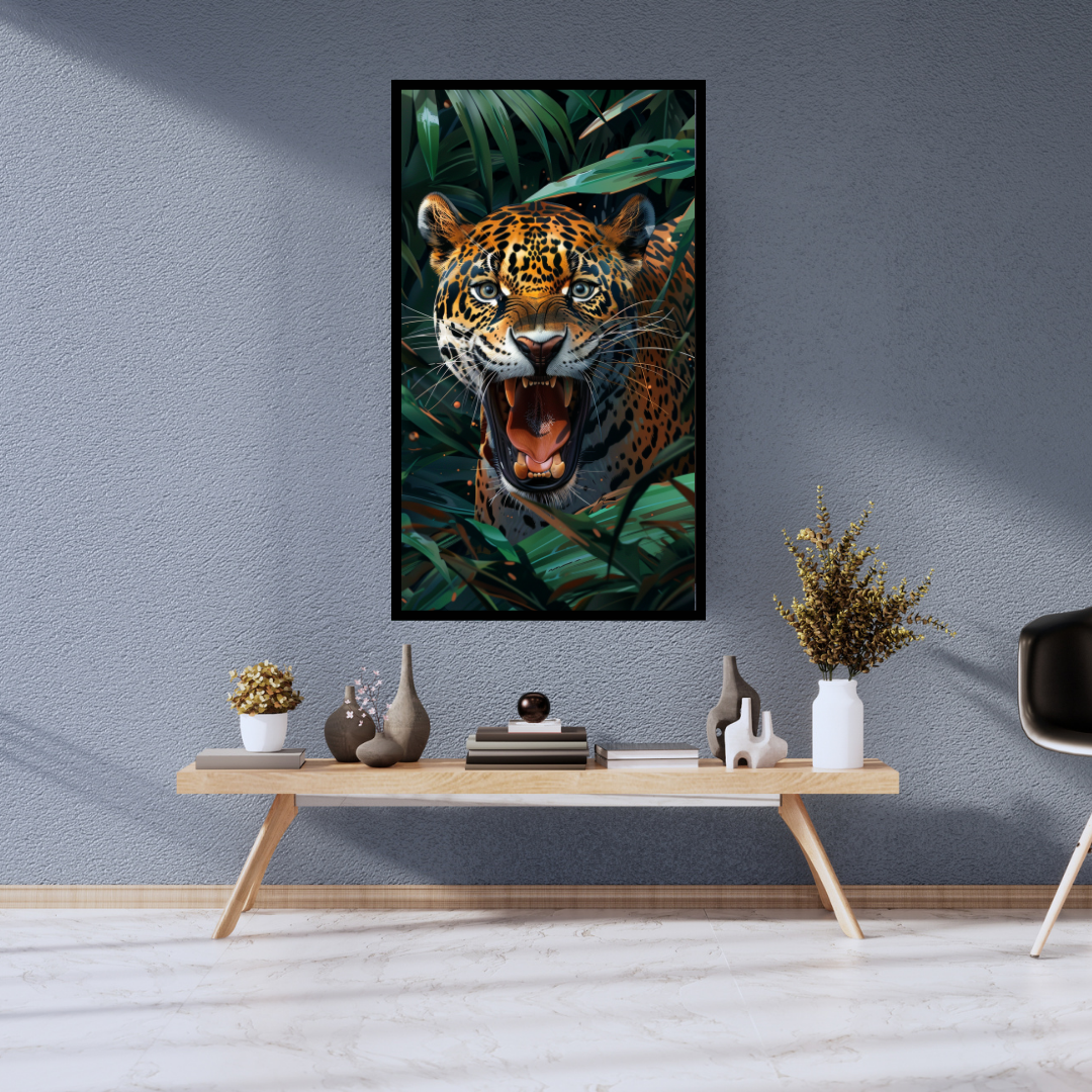 Echo of the Wild” captures the raw power and untamed spirit of a jaguar unleashing a mighty roar from within the dense, vibrant jungle. The intensity of its open mouth and piercing gaze, surrounded by lush green foliage, evokes the primal sounds and fierce beauty of the wild. This vertical canvas print will bring a dynamic and captivating energy to any space in your Amritsar home, serving as a bold statement piece.