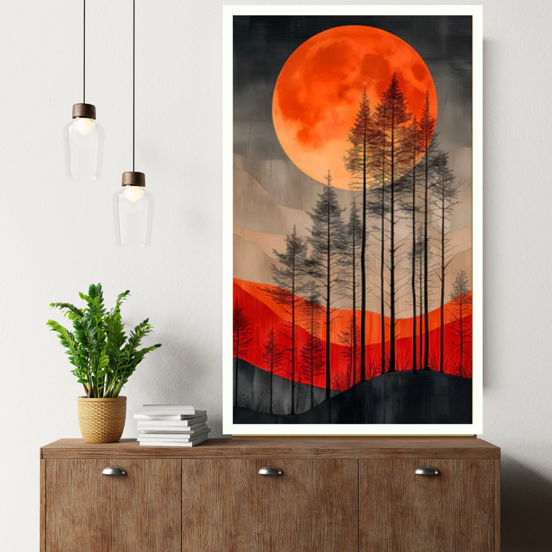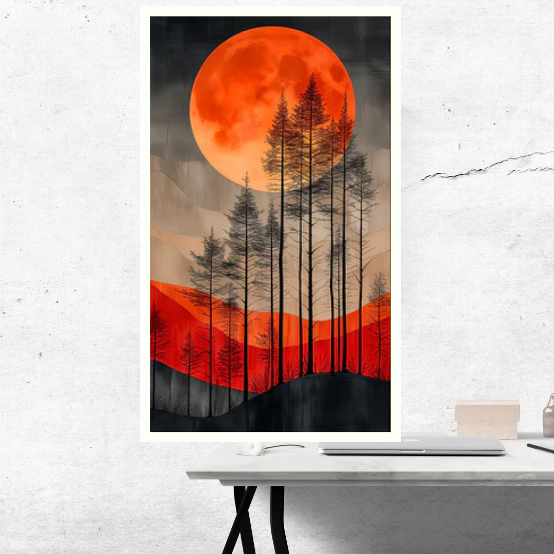 Bring the dramatic beauty and captivating mystery of “Forest and Scarlet Moon” into your home in Amritsar. Select your preferred size and frame color to create a striking piece of art that adds a touch of otherworldly charm to your Indian sanctuary.
