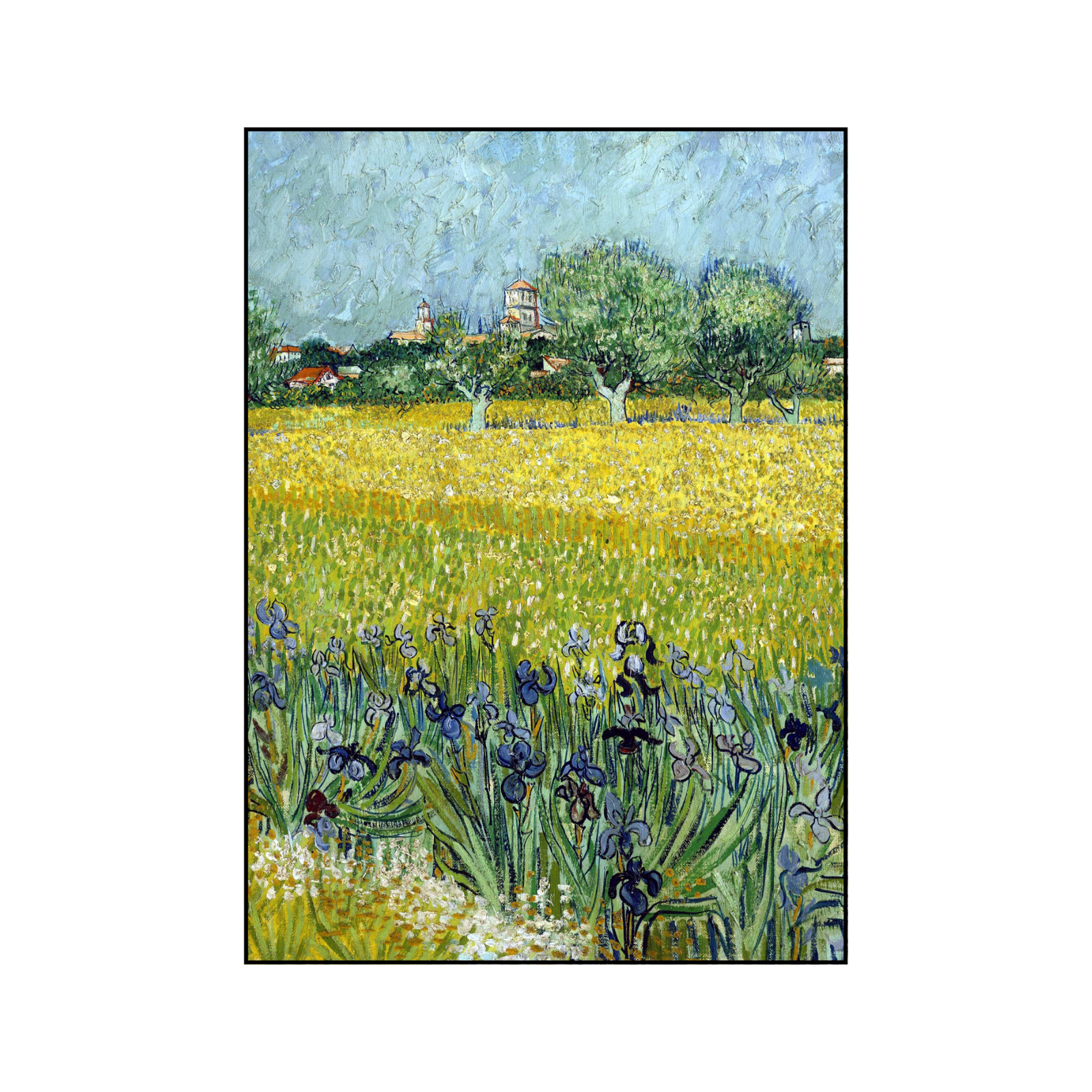 Step into a world of vibrant color and emotional brushwork with “Irises in the Golden Field,” an exquisite canvas print exclusively from Art O Hub. This masterful artwork captures the expressive energy and iconic style of Post-Impressionism, reminiscent of Vincent van Gogh’s most beloved landscapes. The foreground bursts with the rich, textured blues and purples of a field of irises, rendered with bold, swirling brushstrokes that convey movement and life. Beyond, a sea of radiant golden yellow stretches towards a charming distant village nestled amidst lush green trees, all set beneath a dynamic, textured sky of cerulean and gentle clouds.