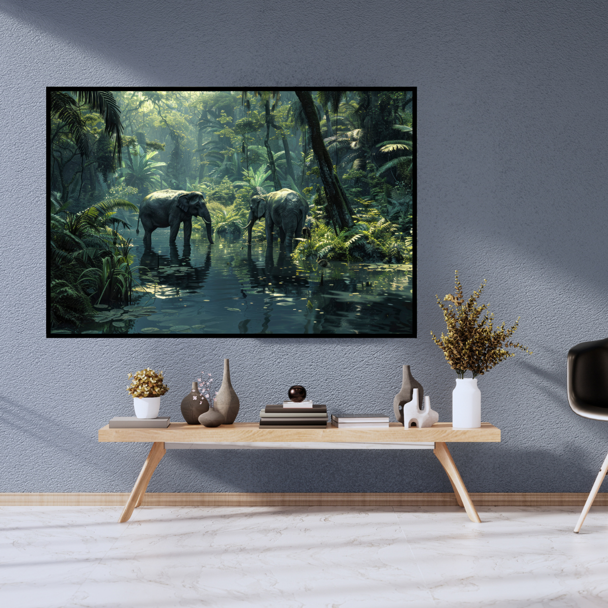- Premium Canvas Print: Expertly printed on high-quality, artist-grade canvas to ensure exceptional detail in the elephants’ textures and the lush jungle foliage.