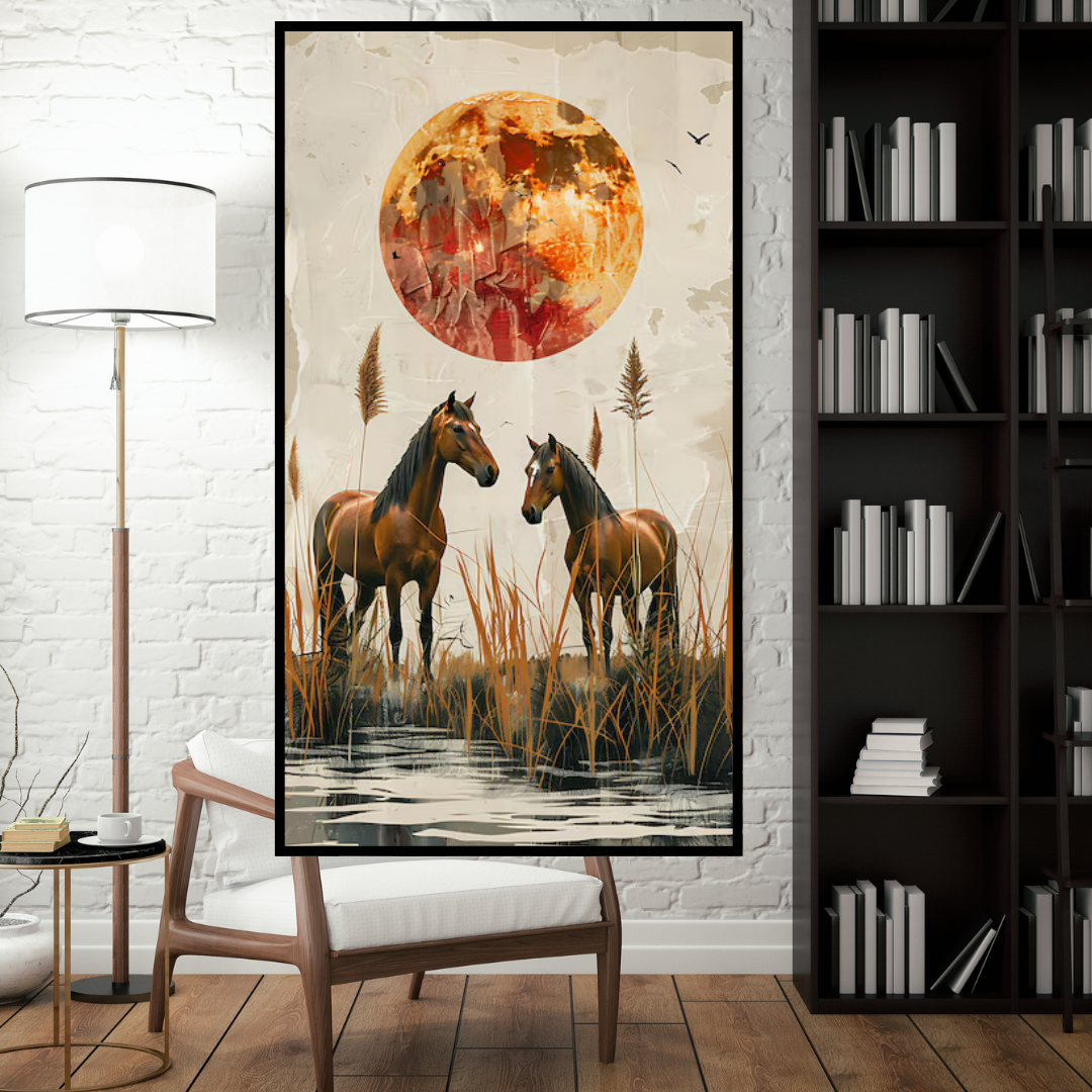 Lunar Horses” captures a serene and slightly mystical scene featuring two beautiful brown horses standing peacefully in a tranquil waterside setting under the glow of a dramatic, textured moon. The warm earth tones of the horses and the surrounding reeds contrast beautifully with the ethereal light of the moon, creating a captivating and evocative image. This artwork brings a touch of nocturnal beauty and quiet companionship to any space in your Amritsar home.