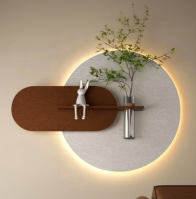 At its heart, a luminous circular backdrop casts a soft, inviting glow, reminiscent of a full moon. Adjacently, a rich, dark brown oval panel provides a warm contrast, adorned with a whimsical touch: a charming, minimalist bunny figure playfully perched on a delicate wooden shelf. This shelf also gracefully supports a clear glass vase holding vibrant artificial greenery, adding a refreshing botanical element that brings life and tranquility to the composition.