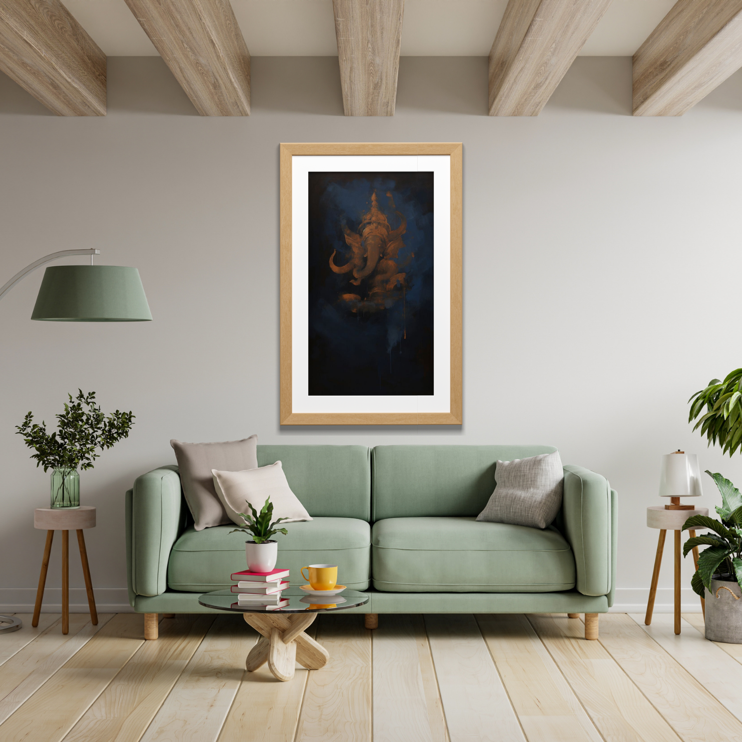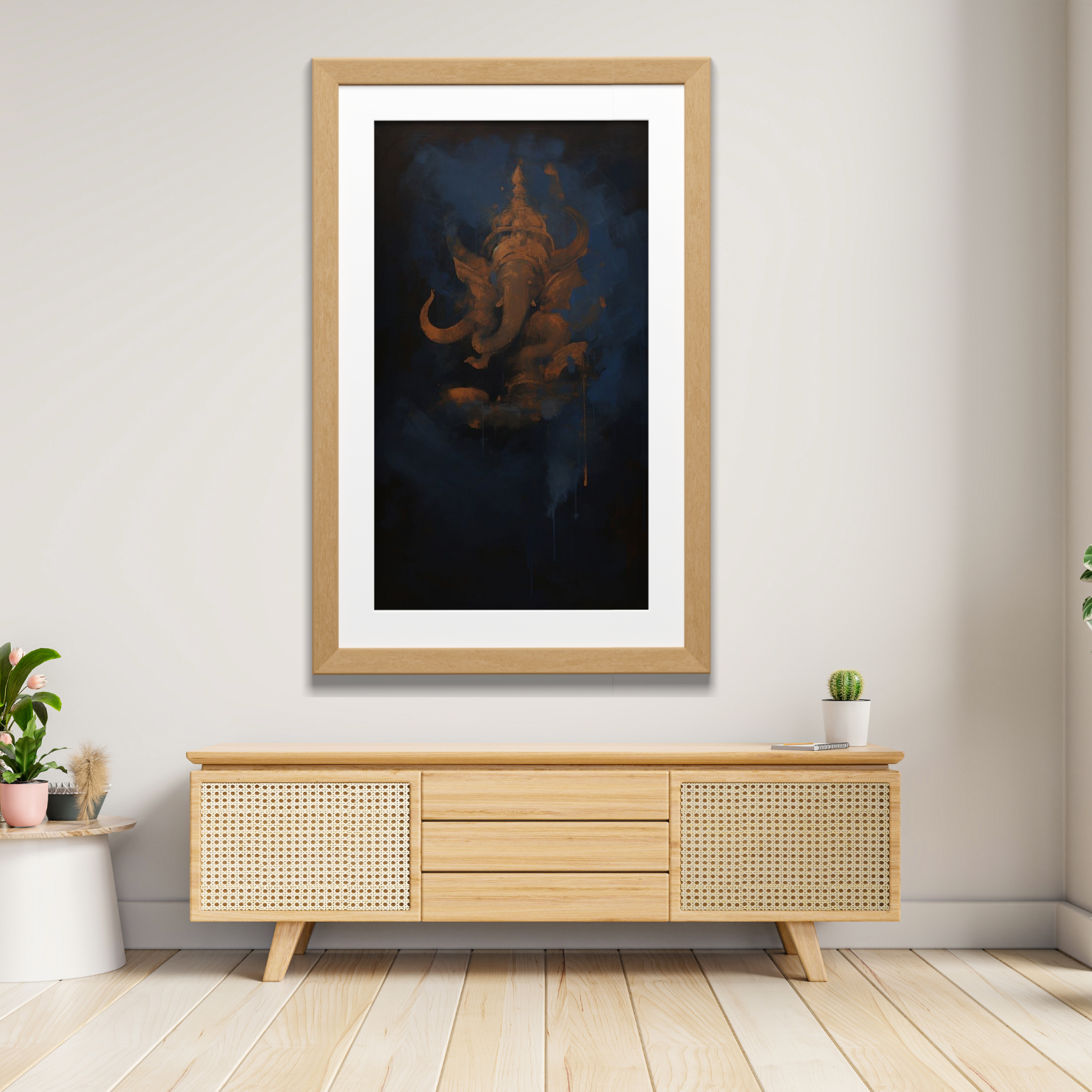 Elevate your space with Mystic Radiance – Ganesha in Gold, a captivating canvas painting that fuses divine tradition with modern elegance. Depicted in glowing shades of gold and orange, Lord Ganesha emerges from a deep indigo-blue background—his serene elephant visage and poised multi-armed form bathed in celestial light. Every brushstroke exudes spiritual calm, wisdom, and the promise of new beginnings.