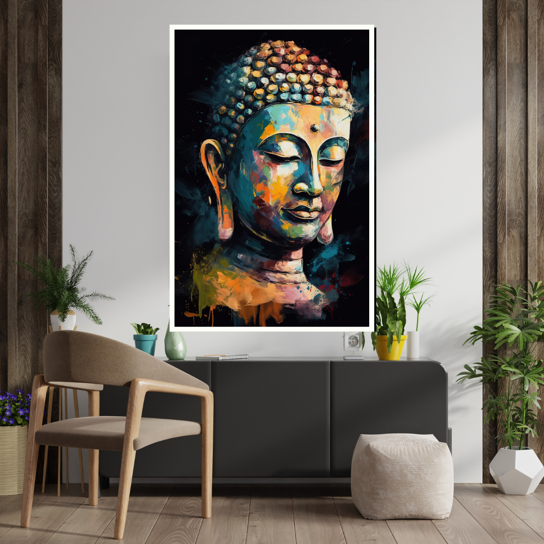 Peaceful Presence” beautifully captures the serene essence of Buddha in deep meditation, rendered with a vibrant and expressive color palette. 1 The rich hues of teal, orange, yellow, and hints of purple and blue create a captivating and uplifting portrayal of inner peace and spiritual contemplation. With eyes gently closed and a tranquil expression, Buddha emanates a sense of calm and enlightenment. This canvas print serves as a radiant reminder of the power of stillness and mindfulness, making it a wonderful addition to any home, meditation space, or yoga studio.