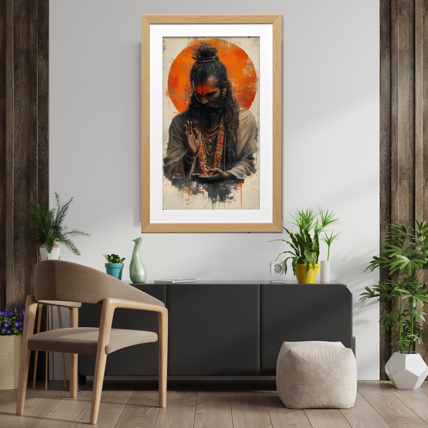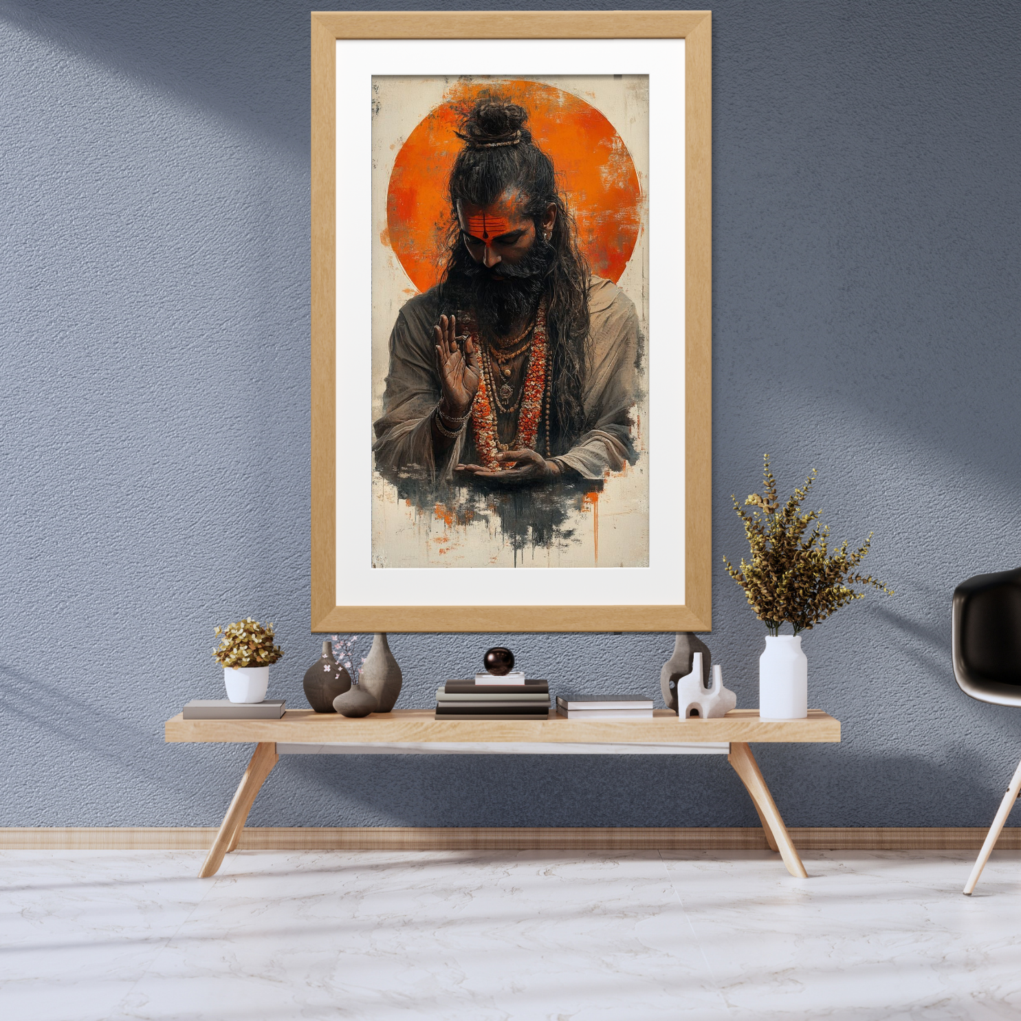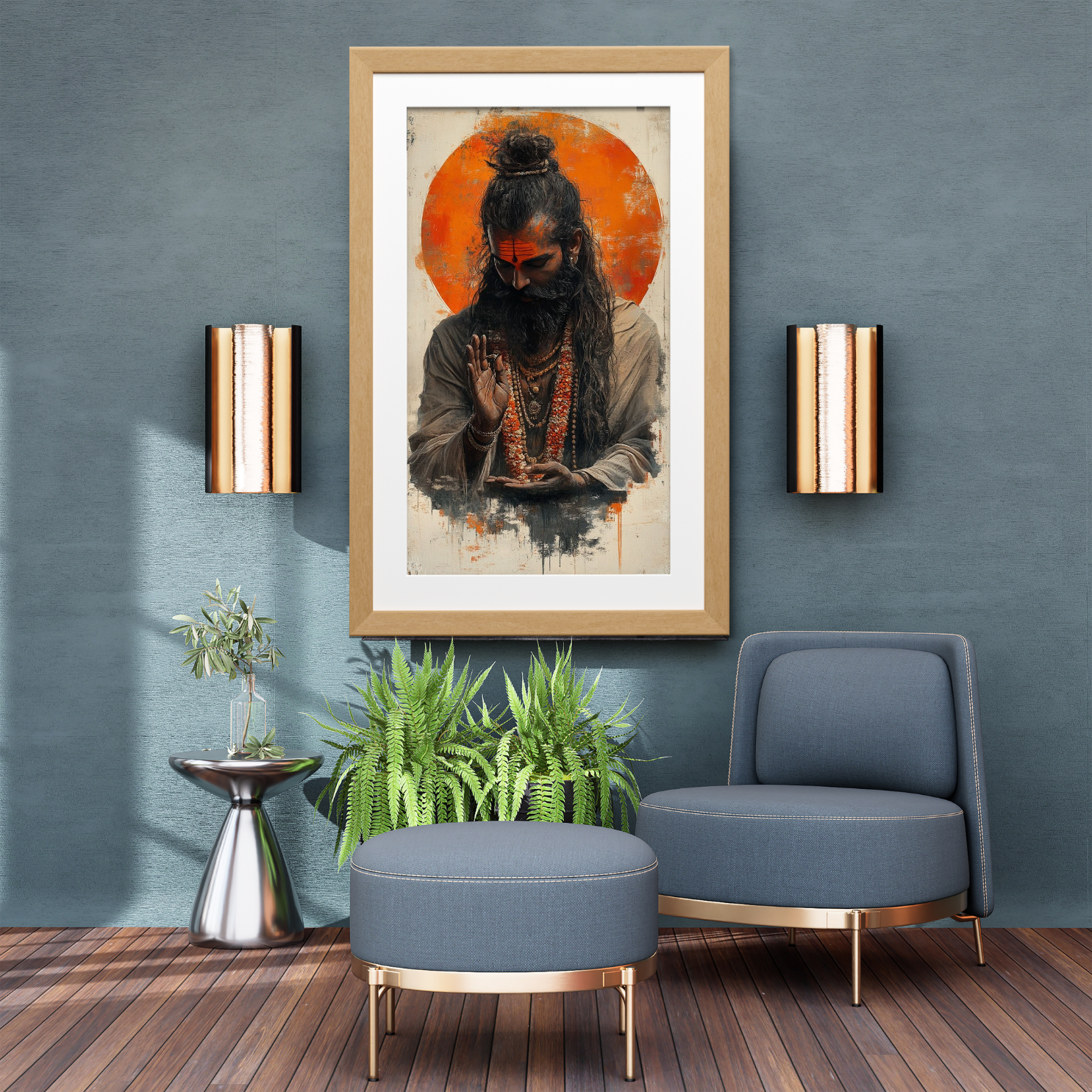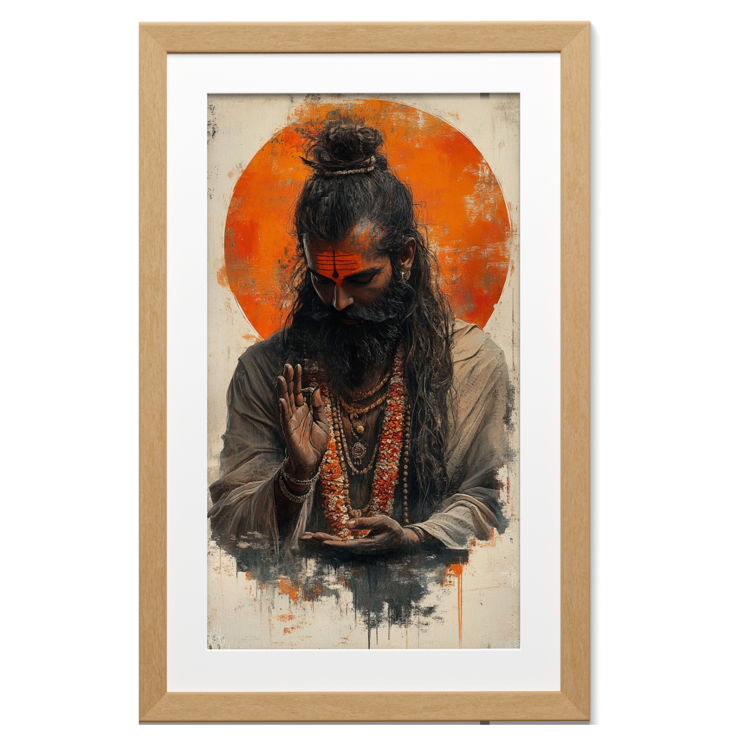 Immerse your space in tranquility with the Sacred Aura painting — a spiritual masterpiece that celebrates tradition, mindfulness, and divine energy. This elegant artwork features a serene monk figure captured in a moment of deep blessing. With long hair tied in a bun and adorned in ritualistic garlands and layered necklaces, the figure offers a symbolic hand gesture conveying peace and protection. The monk’s expression exudes calm wisdom, making it an ideal focal point for introspective environments.