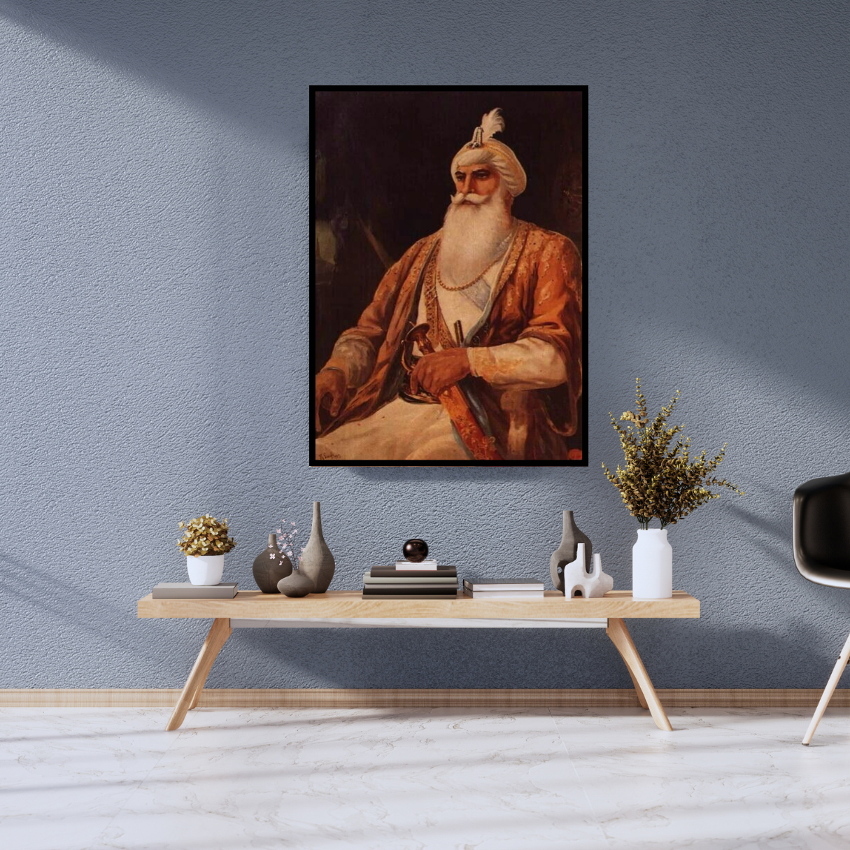 - Gold Frame: Provides an opulent and traditional finish, befitting the esteemed figure and adding a touch of historical grandeur to the artwork, aligning with traditional Indian artistic sensibilities.