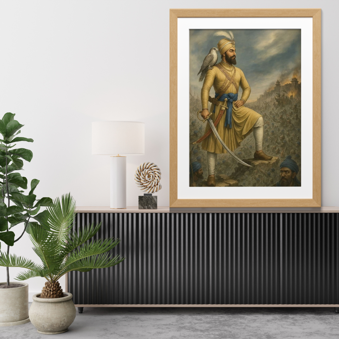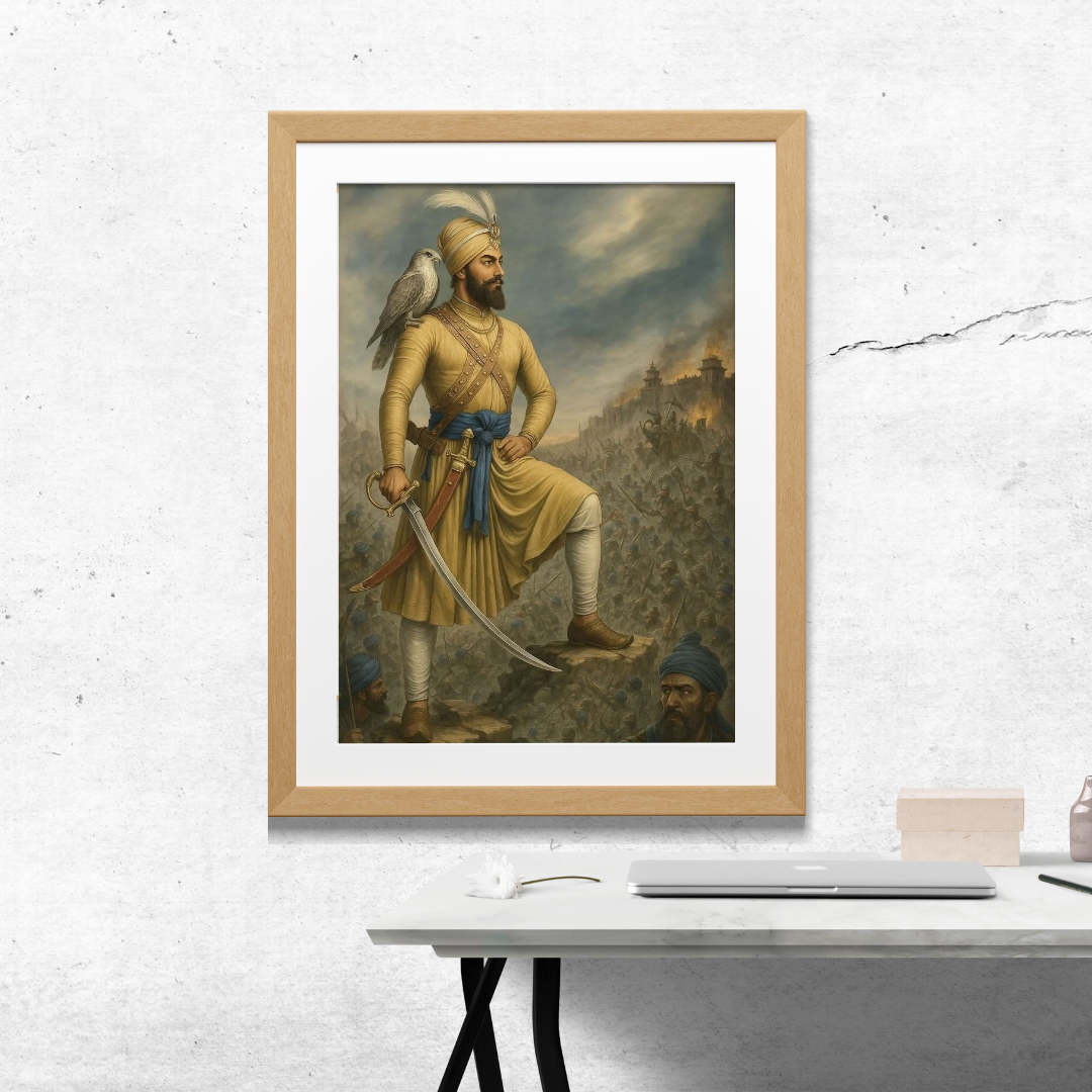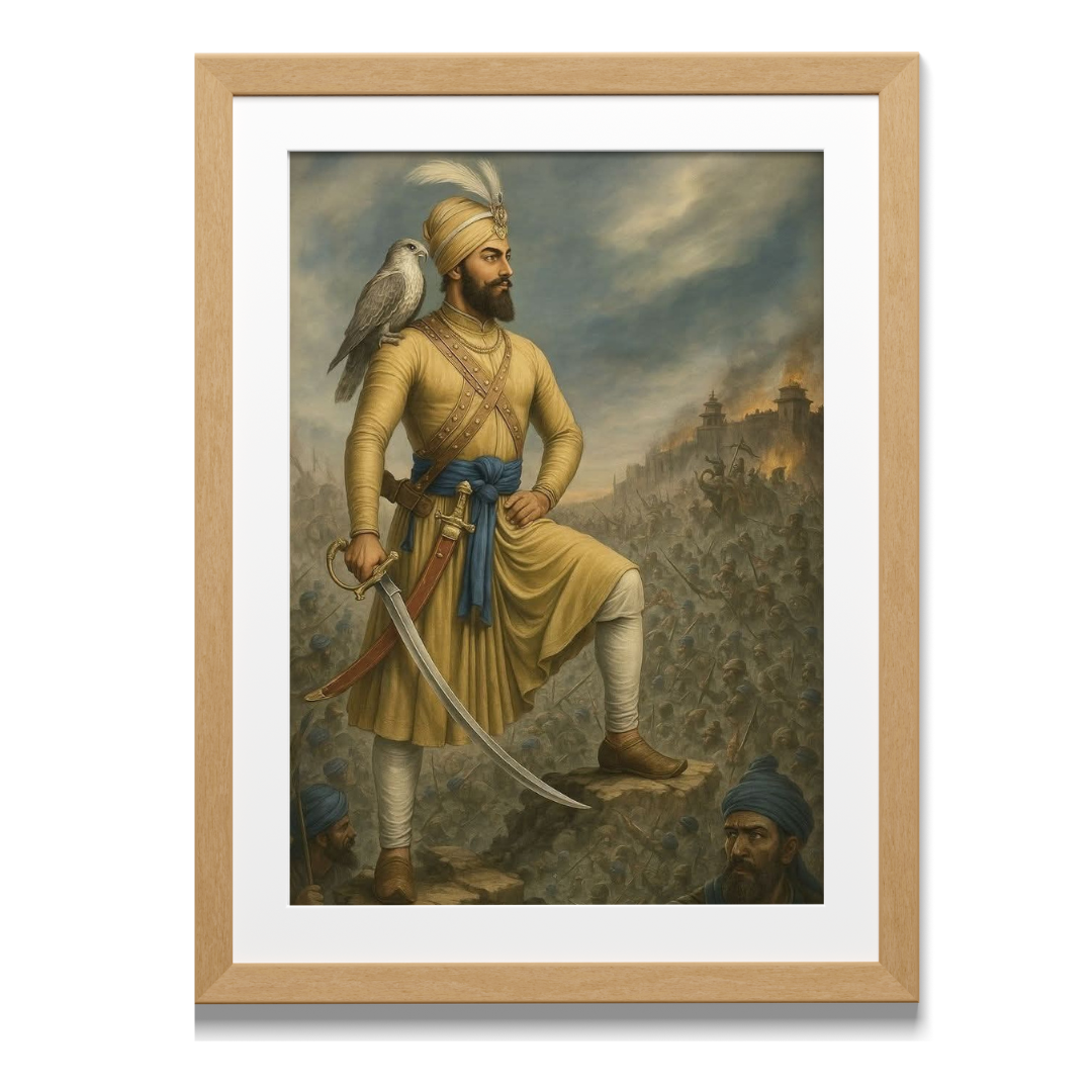 The painting vividly captures his commanding presence, with a majestic falcon perched on his arm, symbolizing foresight and swift action. Dressed in traditional attire and holding a sword, he stands against a backdrop that hints at the challenges and triumphs of his era, with a subtle suggestion of a besieged fort or battle in the distance. The Guru’s serene yet determined expression reflects his unwavering commitment to justice, righteousness (Dharma), and the protection of the innocent. This Sikh spiritual art piece is a powerful tribute to his legacy as the creator of the Khalsa and a beacon of courage.