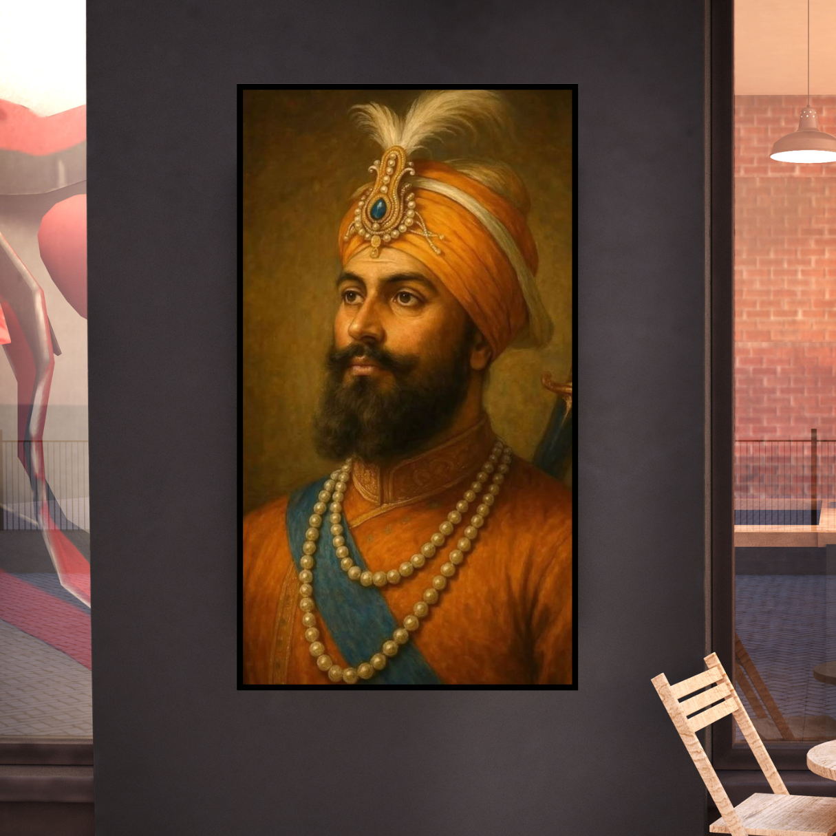 This canvas painting beautifully portrays Shri Guru Hargobind Sahib Ji, the sixth Sikh Guru, revered for his embodiment of both spiritual (Piri) and temporal (Miri) authority. The artwork captures his majestic presence, adorned with a distinguished turban, symbolic jewels, and a serene yet powerful countenance. This portrait serves as a reminder of his strength, righteousness, and pivotal role in Sikh history. Displaying this piece in your Amritsar home is a way to honor his legacy and connect with the rich spiritual heritage of Sikhism.