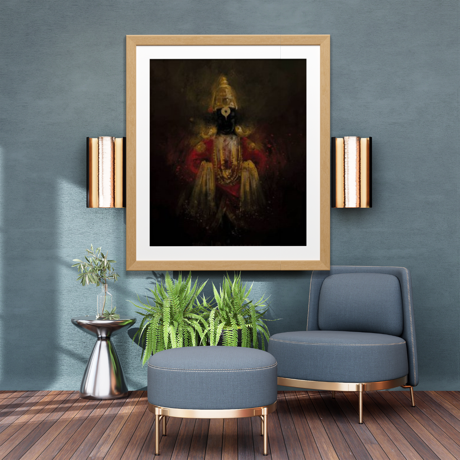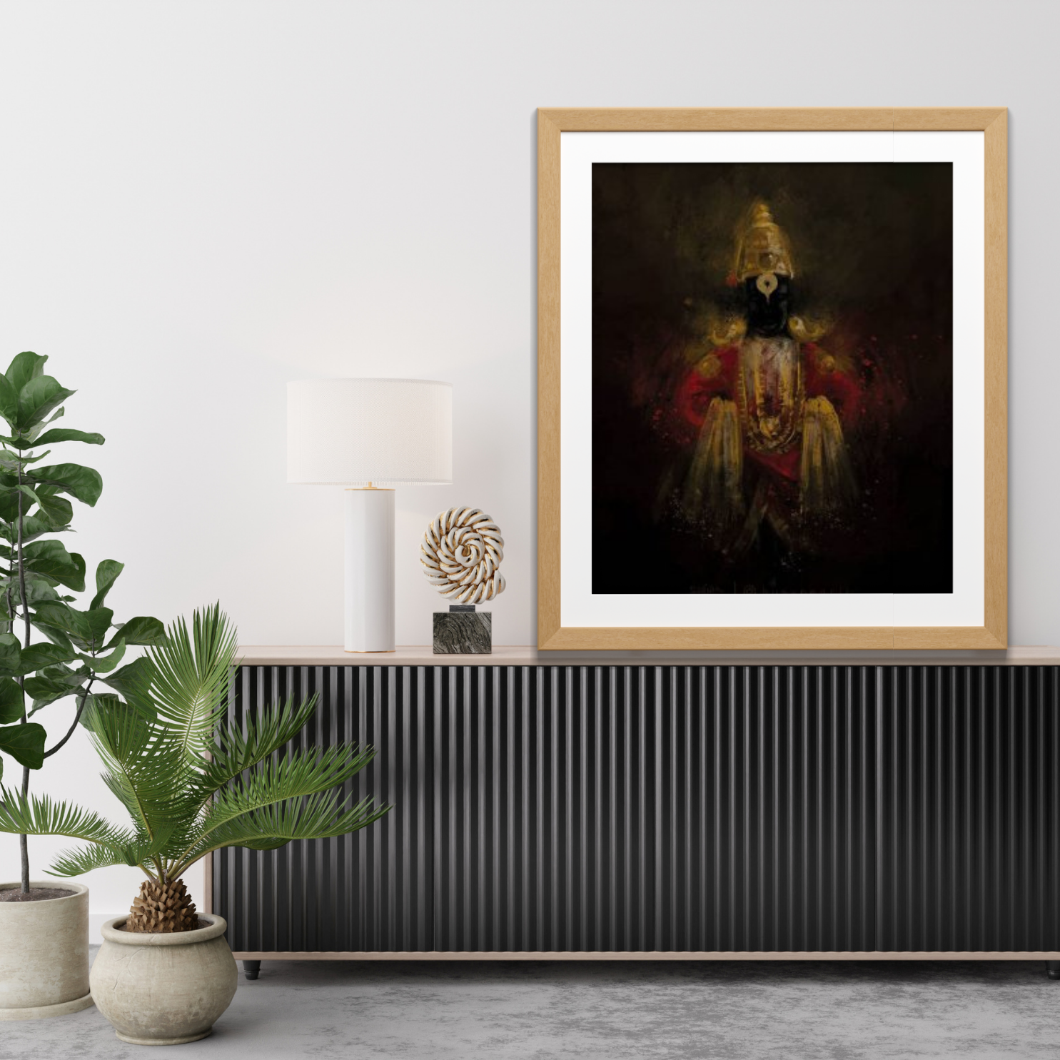 ๐ŸŽจ Medium & Finish: Printed on premium canvas with high-gloss finish to highlight every golden detail. Encased in traditional dark wood framing with gold accents for a temple-like visual appeal.