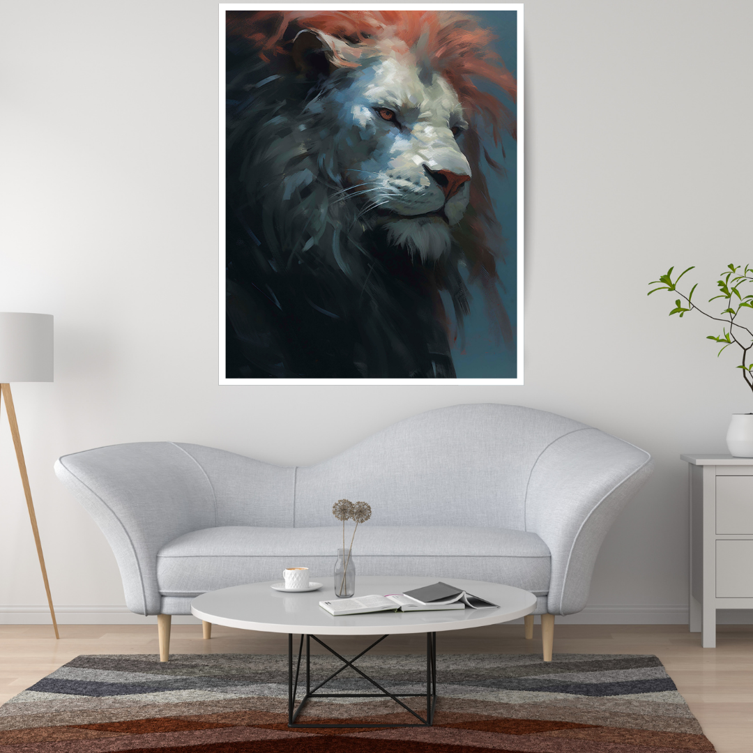 • Black Frame: Offers a sleek, modern edge, providing a strong contrast that accentuates the unique color palette and intense gaze of the white lion.