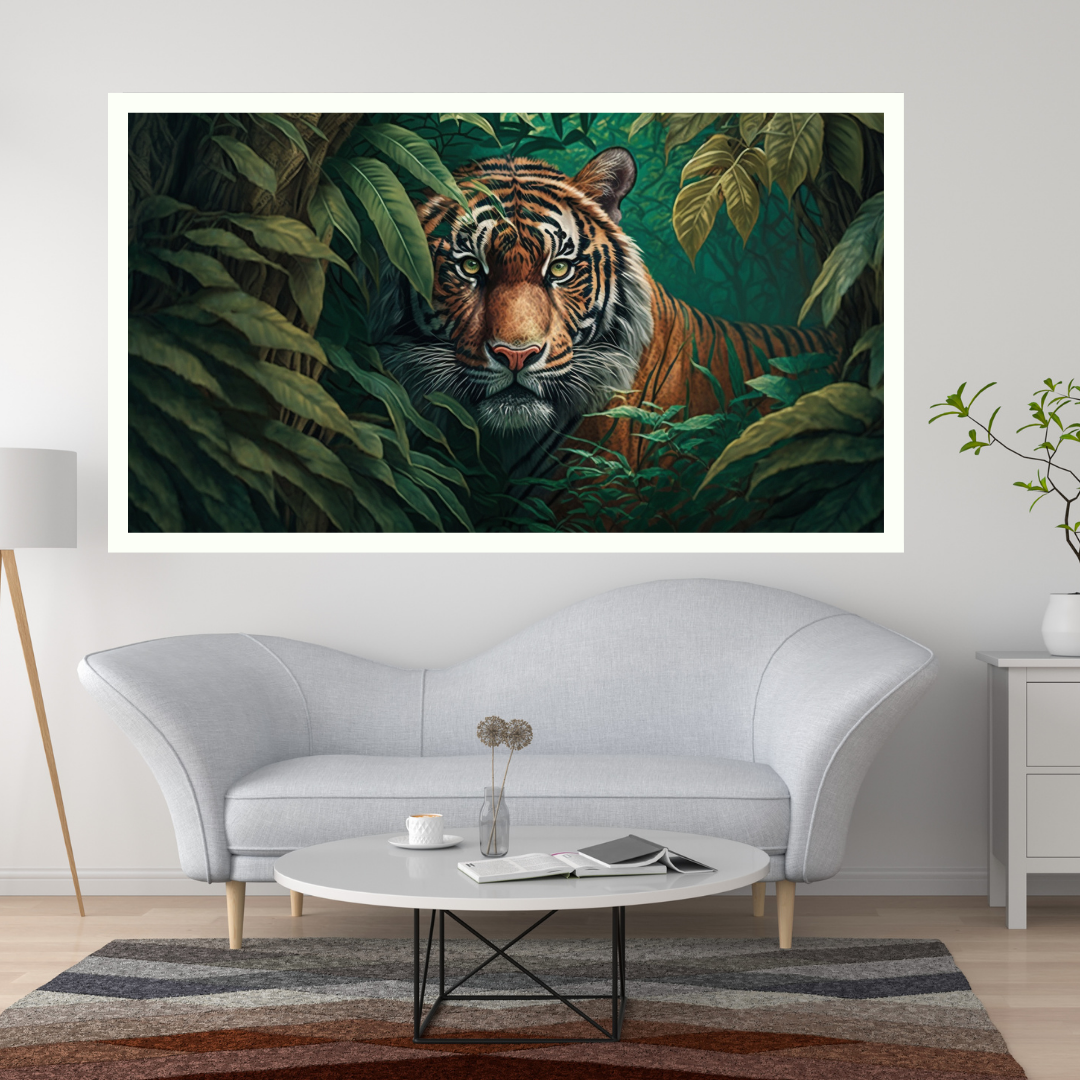 Tiger Art, Jungle Art, Wildlife Painting, Animal Art, Bengal Tiger, Lush Foliage, Powerful Art, Exotic Decor, Black Frame, Brown Frame, White Frame, 16×24 Canvas, 24×33 Canvas, Ready to Hang Art, Nature Art, Amritsar Art, Indian Home Decor.