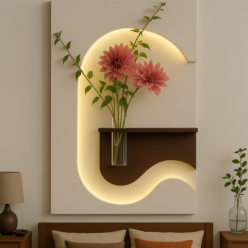 The most striking feature is the sweeping, illuminated curve that gracefully arcs through the panel, creating a radiant path of soft, warm light. This unique design element draws the eye, enveloping the integrated elements in a captivating glow. A minimalist, dark-toned shelf with a refined cutout is seamlessly placed along this curve, serving as a base for a slender glass vase. This vase beautifully showcases lush artificial branches adorned with two vibrant, soft pink blossoms, which are dramatically silhouetted and illuminated by the ambient light behind them. The organic flow of the light path combined with the natural beauty of the flowers creates a serene and enchanting visual experience.