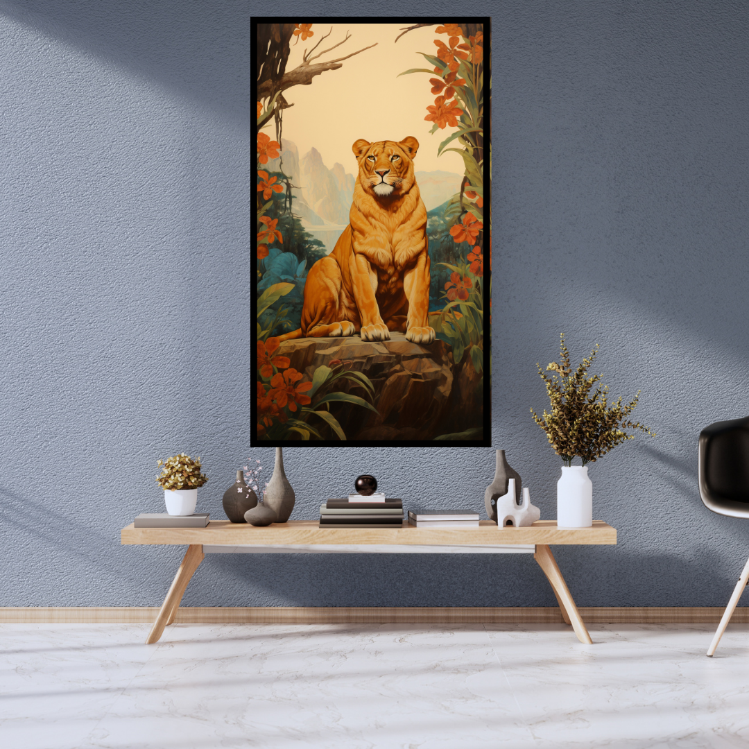 Bring the untamed beauty and regal presence of “The Jungle Queen” into your home. Select your preferred size and frame color to create a stunning piece of art that will captivate and inspire for years to come.