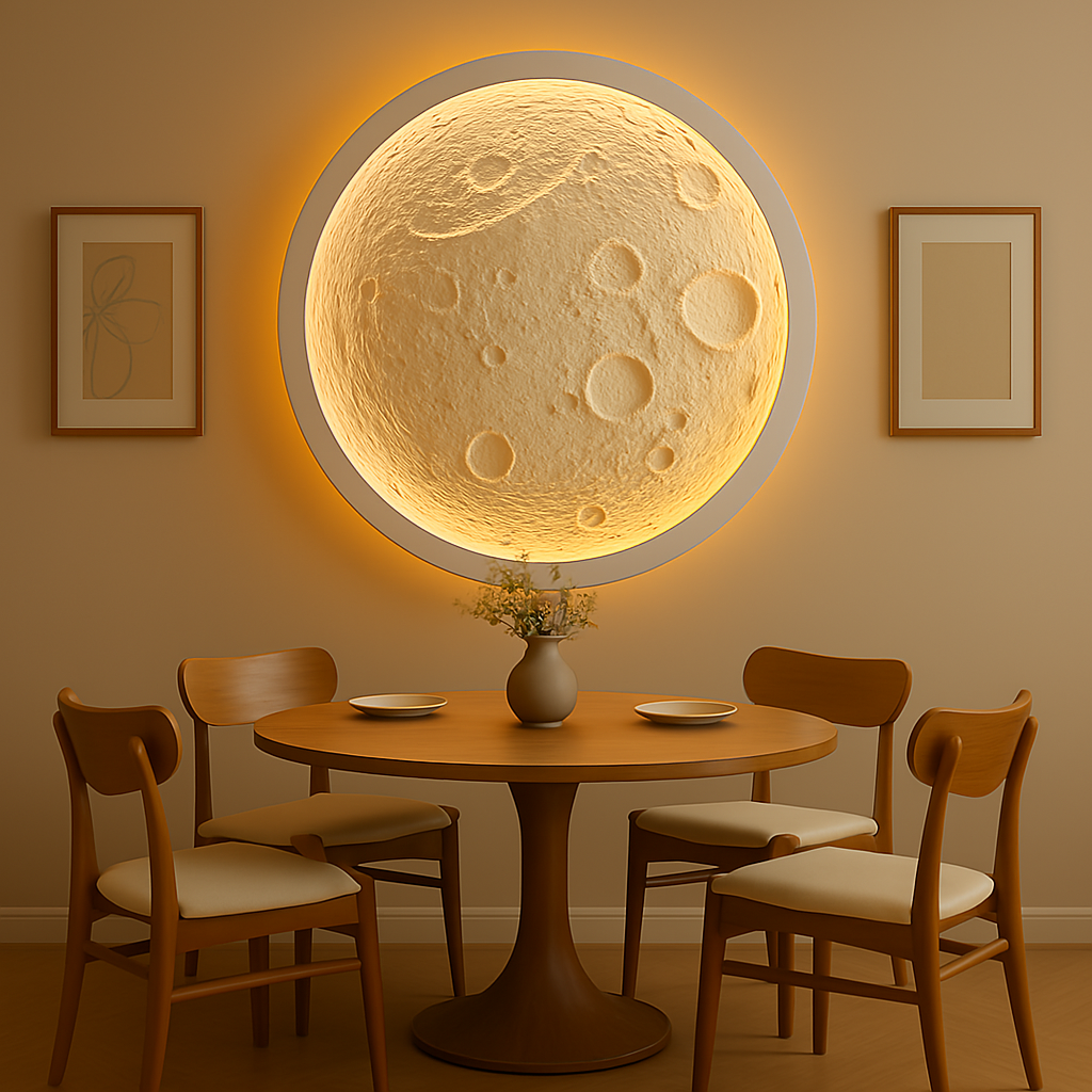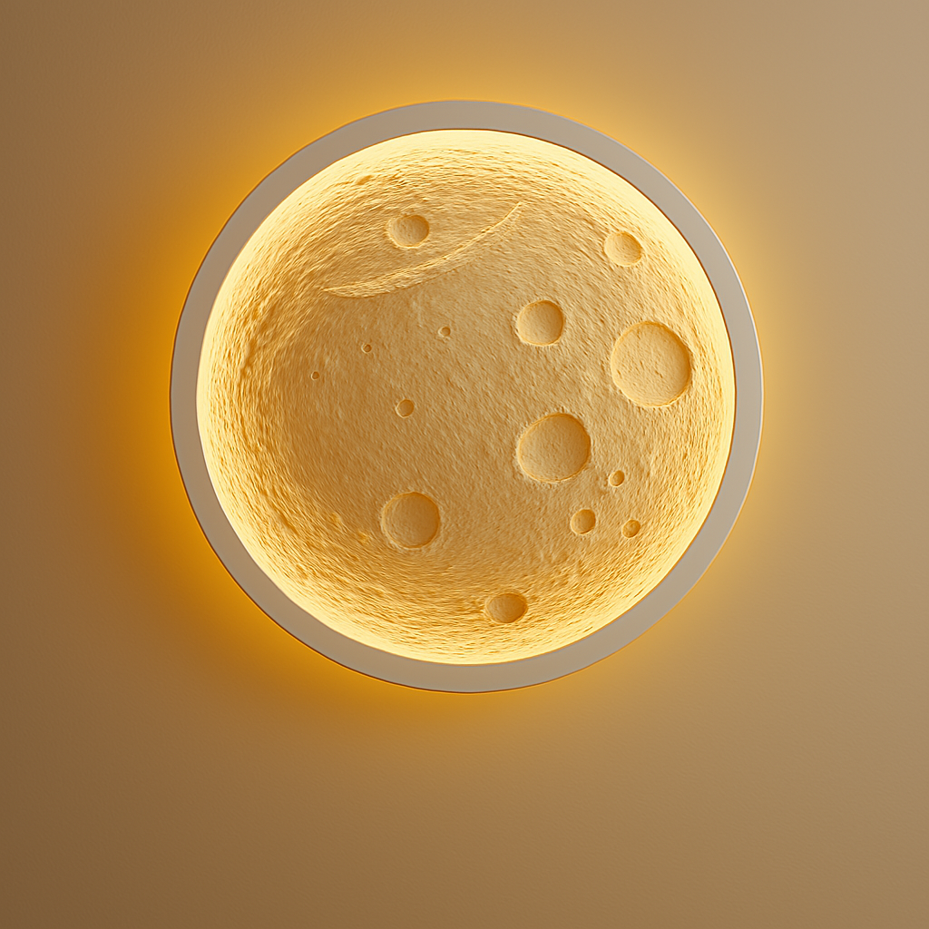 The centerpiece is a deeply textured, cratered surface, meticulously crafted to mimic the rugged, ethereal landscape of the moon. A subtle yet powerful LED light ring frames the entire circumference, casting a warm, ambient glow that enhances every contour and crevice of the lunar-like texture. This illumination creates a stunning halo effect, making the craters appear even more pronounced and transforming the piece into a glowing, three-dimensional celestial body that mesmerizes viewers.