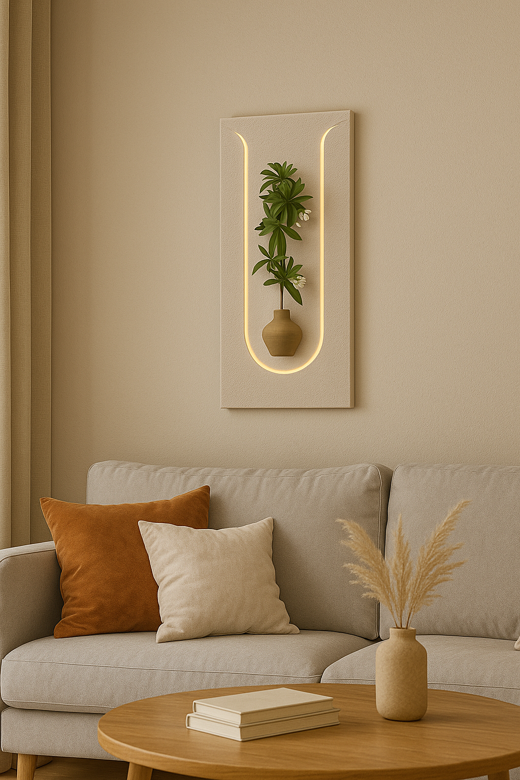 Introduce a sophisticated blend of natural elegance and contemporary illumination into your home with “The Terra Glow,” an exquisite handcrafted wall planter sconce from Art O Hub. This captivating piece features a serene, light-toned rectangular panel with gracefully rounded corners, framing a gentle, U-shaped internal light that casts a warm, inviting glow.