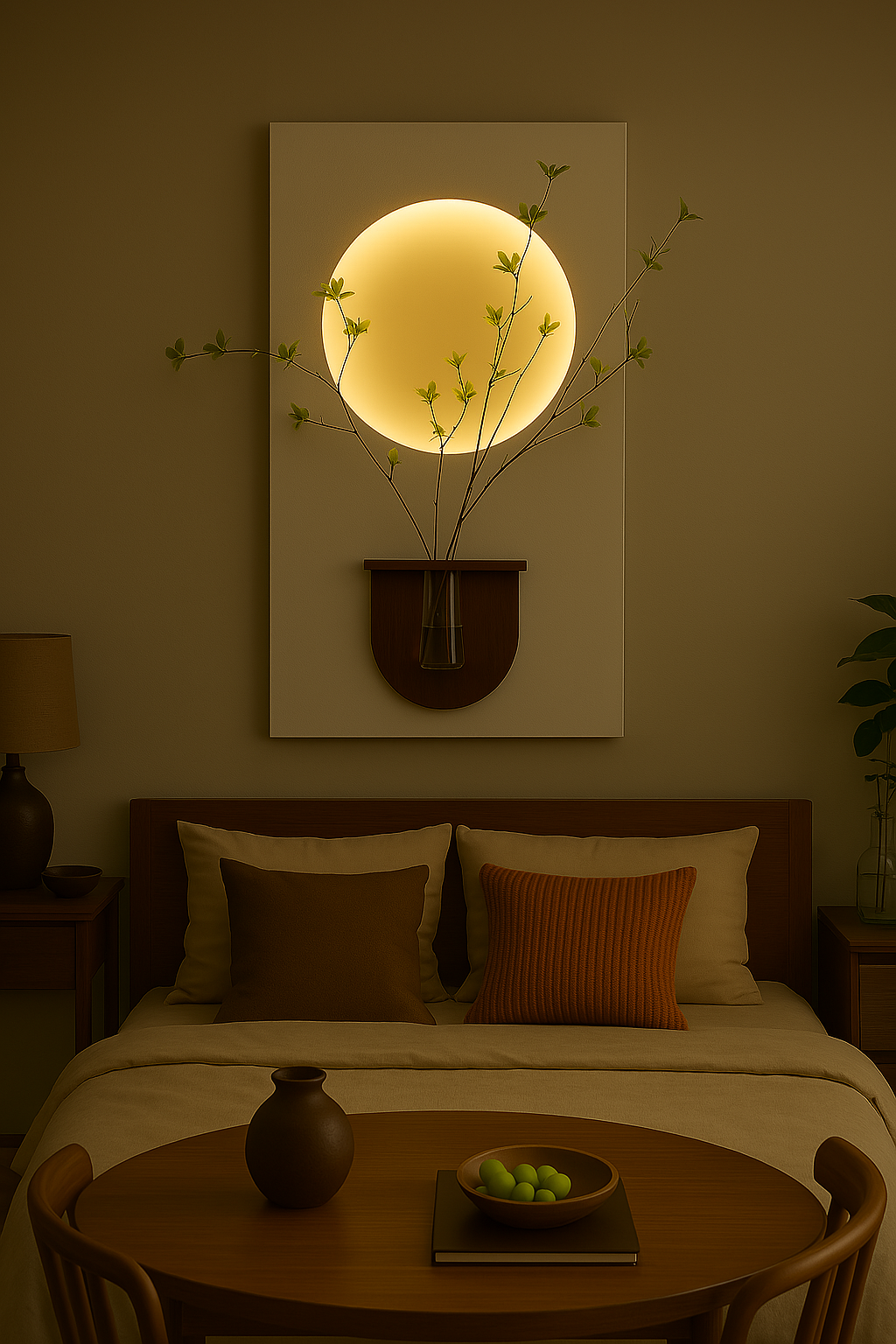 The focal point is a large, luminous circular light embedded within the panel, casting a soft, warm halo that evokes the tranquil glow of a rising sun or full moon. From the base of this radiant circle, a beautifully integrated, curved planter-shelf in a rich, dark wood tone extends, gracefully holding a slender glass vase. This vase cradles realistic artificial branches with delicate green leaves, creating a silhouette that is artfully highlighted by the glowing circle behind it. The design thoughtfully combines modern minimalism with organic elements, creating a calming and sophisticated ambiance.
