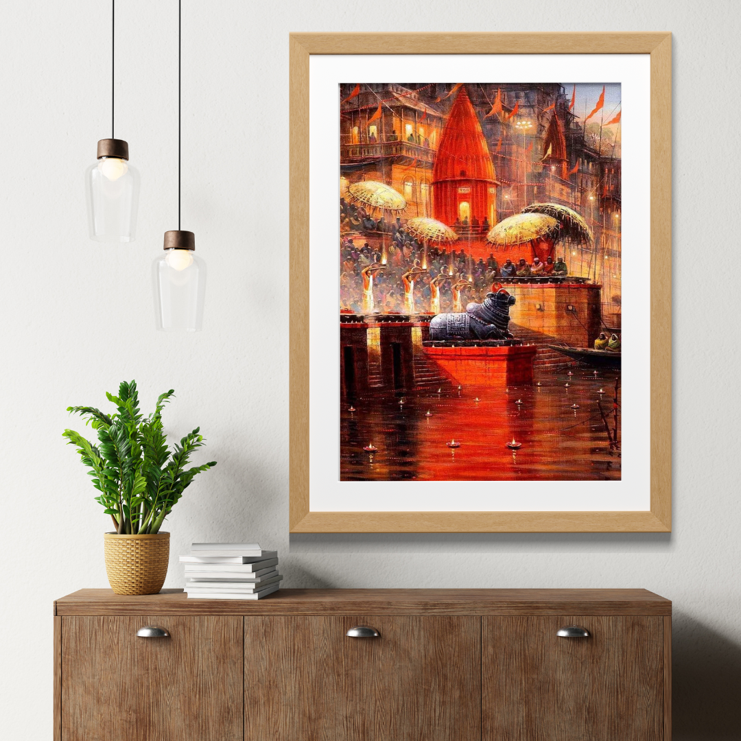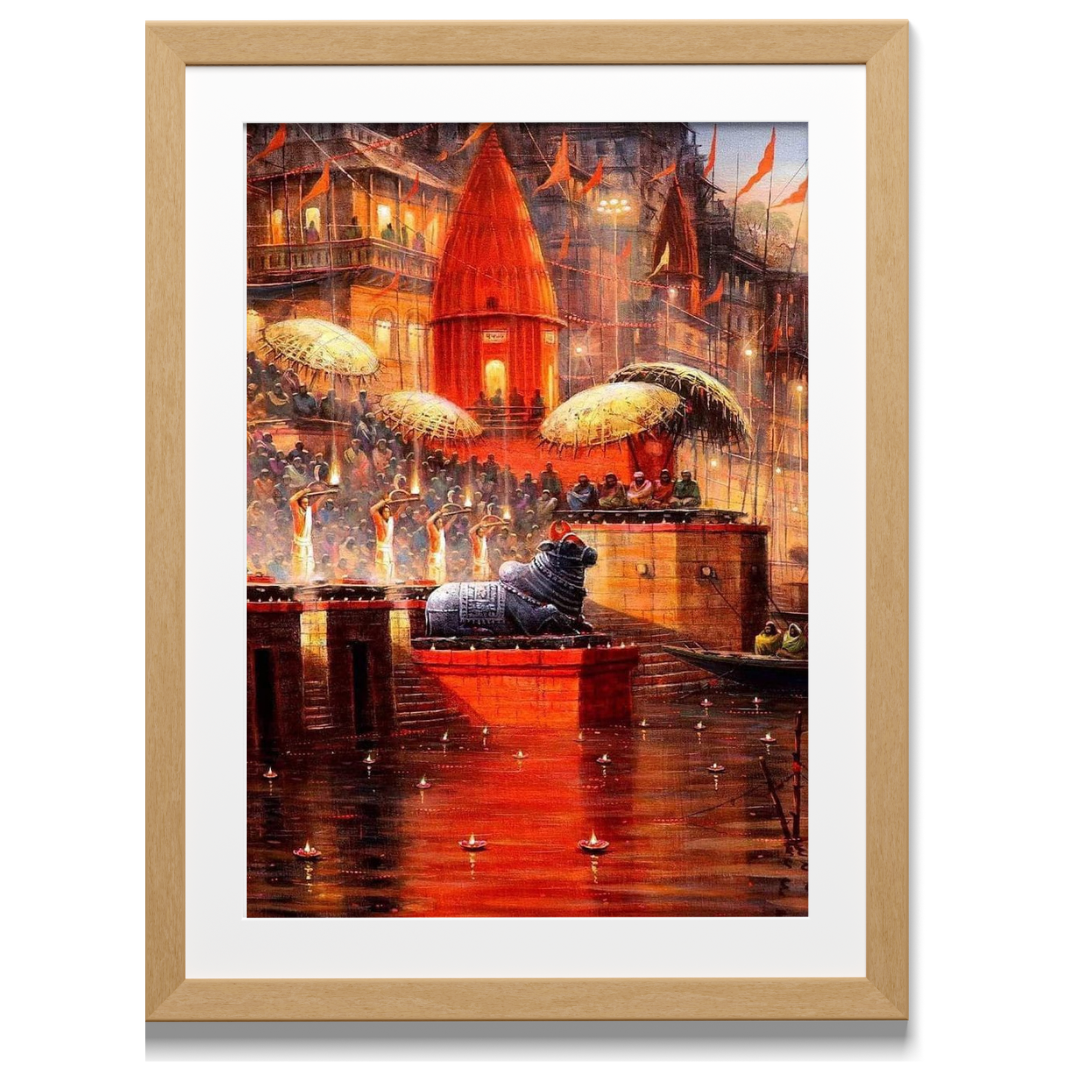 The painting beautifully illuminates the ritual, with priests performing the sacred fire ceremony, their movements reflected in the shimmering waters of the Ganges River. The warm glow of countless lamps, the intricate temple architecture, and the silhouettes of devotees create an atmosphere of profound devotion and timeless tradition. The iconic Nandi statue overlooking the river adds to the sanctity of the scene, while floating diyas (lamps) drift gently on the water, carrying prayers and hopes. This Indian spiritual art piece is a celebration of faith, culture, and the eternal flow of life.