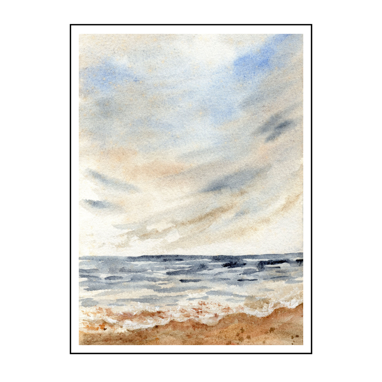 Bring the calming embrace of the seaside into your home with “Whispers of the Coast,” an exquisite canvas print exclusively from Art O Hub. This beautiful watercolor artwork captures the serene tranquility of a quiet beach scene. Soft, muted tones dominate the composition, with warm sandy browns in the foreground giving way to gentle, frothy waves rendered in delicate blues and greys. Above, a expansive sky, filled with subtly blended clouds in peaceful blues, soft greys, and faint hints of blush, evokes the quiet magic of a coastal day.